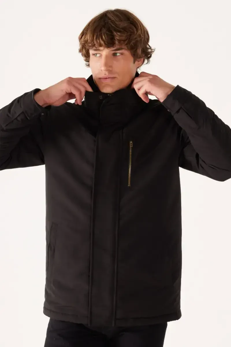Regular fit hooded black parka is an ideal option to keep you stylish and warm in cold weather. Perfect for daily use, this parka combines comfort and functionality. Thanks to its hood, it protects your head in rainy and windy weather, while its regular fit does not restrict your freedom of movement. Its black color can be easily combined with any outfit and offers a timeless look. This parka, which will suit both your sporty and classic style, is a candidate to be an indispensable part of your wardrobe. Thanks to its quality material structure, it offers long-lasting use and is resistant to cold weather conditions. The zippered and buttoned front closure system prevents cold air from entering the parka, while you can safely carry your personal belongings in its pockets. Designed for those looking for style and comfort together, this black parka will be your best friend to accompany you on cold winter days. It allows you to always look stylish in your daily activities, weekend trips or while walking around the city. It provides extra warmth thanks to its inner lining, while its light structure does not weigh you down. The regular fit cut is compatible with every body type and offers comfortable use. The hooded design protects your head and neck in cold weather, and you can adjust the tightness of the hood as you wish with its adjustable cords. Black is always a fashionable and easy-to-combine option. This parka will easily match other pieces in your wardrobe and give you the freedom to create different combinations. This parka, which is both stylish and functional, will be indispensable in cold weather. With its quality material structure, long-lasting use and stylish design, this parka will meet your expectations and always satisfy you. If you don't want to compromise on your style when going out in cold weather, regular fit hooded black parka is just for you. Stay warm and protect your style with this parka.**Product Description**Regular fit hooded black parka is an ideal option to keep you stylish and warm in cold weather. Perfect for daily use, this parka combines comfort and functionality. Thanks to its hood, it protects your head in rainy and windy weather, while its regular fit does not restrict your freedom of movement. Its black color can be easily combined with any outfit and offers a timeless look. This parka, which will suit both your sporty and classic style, is a candidate to be an indispensable part of your wardrobe. Thanks to its quality material structure, it offers long-lasting use and is resistant to cold weather conditions. The zippered and buttoned front closure system prevents cold air from entering the parka, while you can safely carry your personal belongings in its pockets. Designed for those looking for style and comfort together, this black parka will be your best friend to accompany you on cold winter days. It allows you to always look stylish in your daily activities, weekend trips or while walking around the city. It provides extra warmth thanks to its inner lining, while its light structure does not weigh you down. The regular fit cut is compatible with every body type and offers comfortable use. The hooded design protects your head and neck in cold weather, and you can adjust the tightness of the hood as you wish with its adjustable cords. Black is always a fashionable and easy-to-combine option. This parka will easily match other pieces in your wardrobe and give you the freedom to create different combinations. This parka, which is both stylish and functional, will be indispensable in cold weather. With its quality material structure, long-lasting use and stylish design, this parka will meet your expectations and always satisfy you. If you don't want to compromise on your style when going out in cold weather, regular fit hooded black parka is just for you. Stay warm and protect your style with this parka.**Product Features*** Regular Fit* Hooded Design* Black Color* Zippered and Buttoned Front Closure* Multiple Pockets (Inside and Outside)* Cold Weather Resistant Material* Suitable for Daily Use* Stylish and Functional* Long-lasting Use* Easy to Combine**Additional Information**For long-lasting use of the product, follow the washing instructions on the label. Different size options are available. You can check the product label for the product's fabric content and other detailed information.