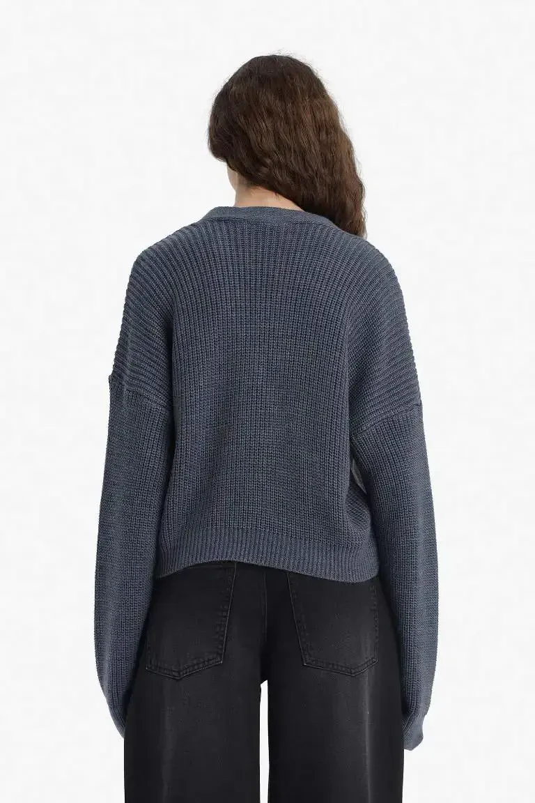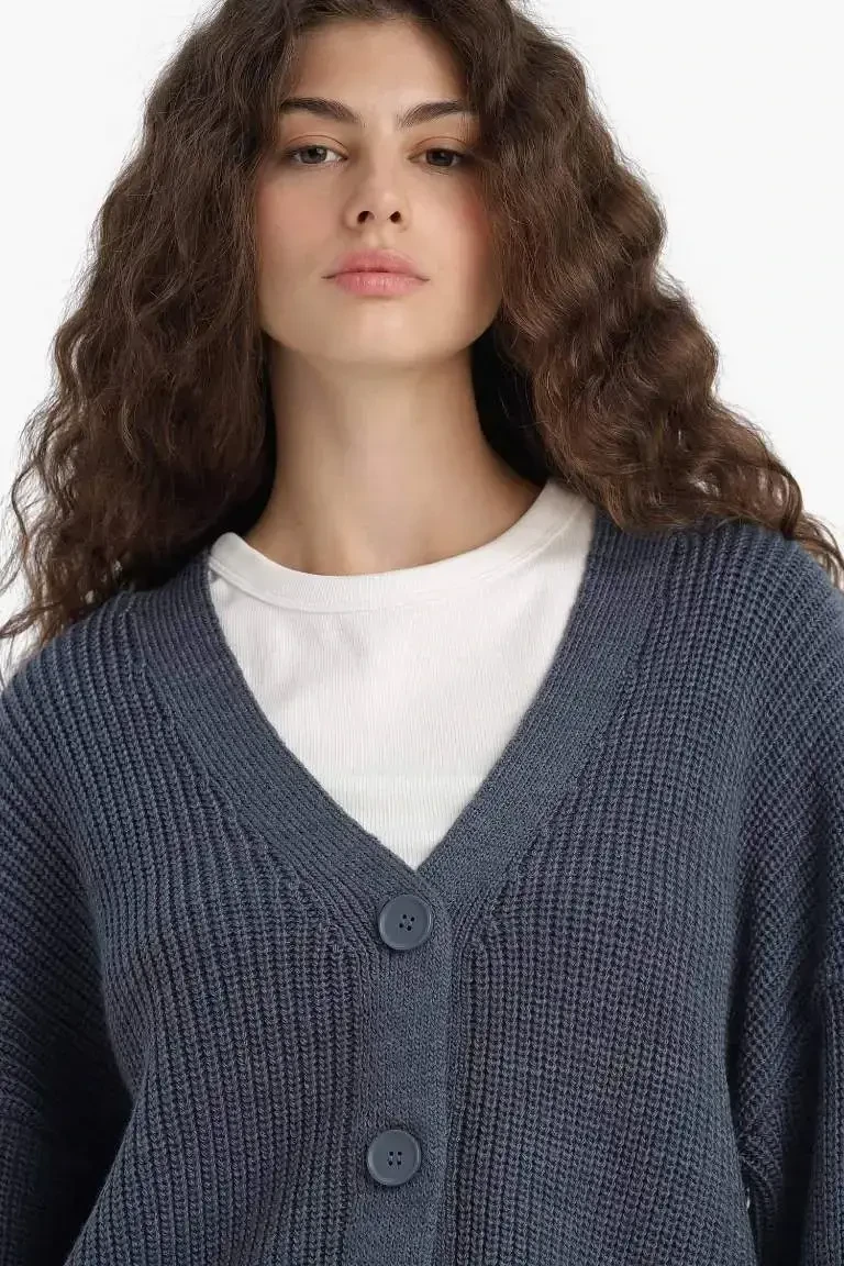 This V-neck button-down knit cardigan offers a comfortable fit with its regular fit cut, combining elegance and comfort. Thanks to its soft cotton blend fabric, you can feel comfortable all day long, and you can reflect your style with its indigo color. It is an ideal choice for both daily use and special occasions.Product DescriptionRegular Fit V-Neck Button-Down Knit Cardigan-Indigo is a candidate to be the indispensable part of your wardrobe. Offering comfort and elegance together, this cardigan will easily adapt to any combination with its indigo color. In addition to daily use, it is also an elegant option that will complete your style at special invitations. Its soft cotton blend texture leaves a pleasant feeling in contact with your skin and offers a comfortable experience throughout the day. The V-neck cut adds a modern and sophisticated look, while the buttoned design provides ease of use. Whether you wear it over your t-shirt to create a casual style or combine it with your shirt to achieve a more stylish look. This cardigan helps you reflect your style in the best way in any situation. Moreover, thanks to its regular fit cut, it fits your body perfectly and does not restrict your freedom of movement. The elegance of the indigo color allows you to attract attention in any environment and adds a different dimension to your style. Regular Fit V-Neck Button-Down Knit Cardigan-Indigo is not just a cardigan, but also a way to express your style. It is an ideal choice to feel special and always look stylish. Enjoy both comfort and elegance with this cardigan.Product Features* Regular fit cut* V-neck* Buttoned design* Soft cotton blend texture* Indigo color* Suitable for daily and special occasions* Comfortable use* Stylish appearance* Easy to combineAdditional InformationTo ensure the product's long life, follow the washing instructions on the label. Iron at low temperature. Do not use bleach.
