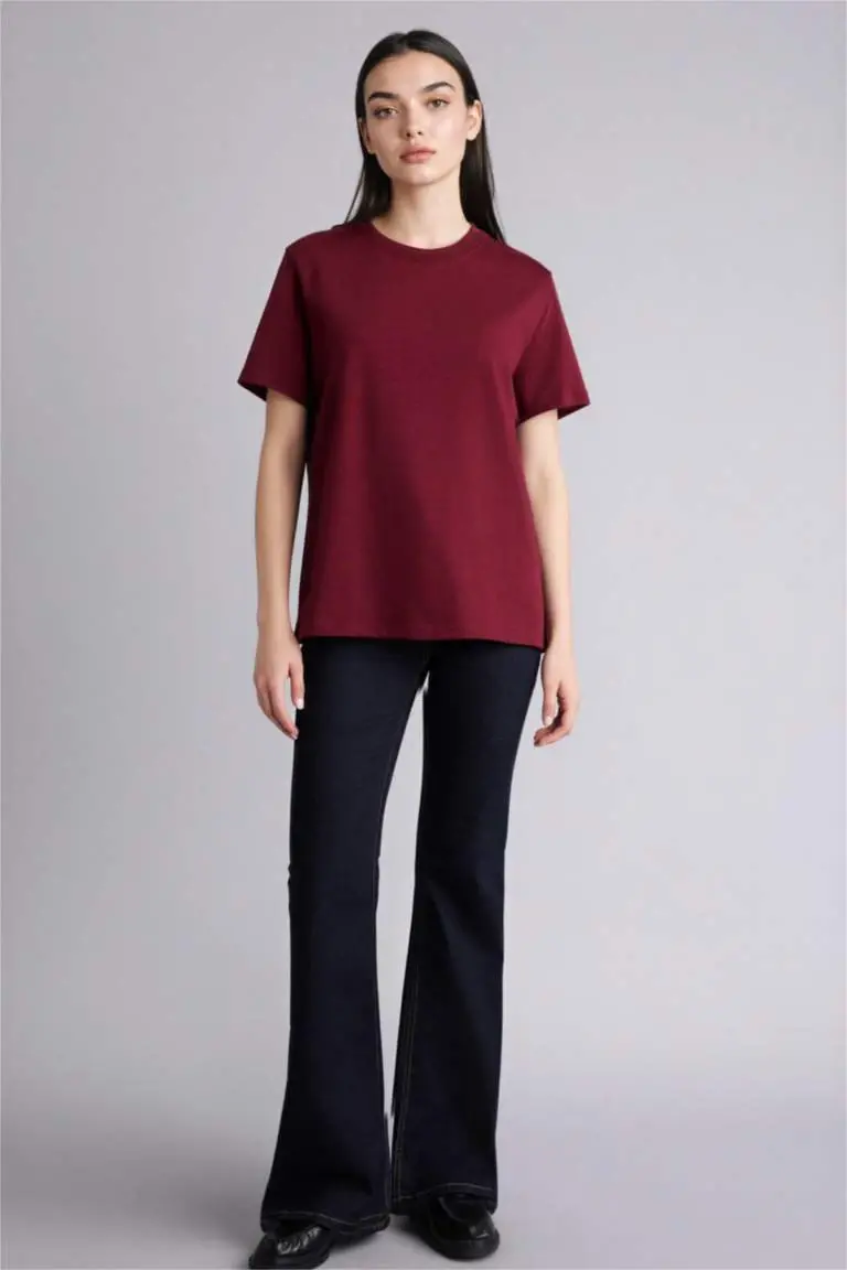 Regular Fit Velosiped Yoqasi Basic Tekis Premium Qisqa Yengli Futbolka-Bordo