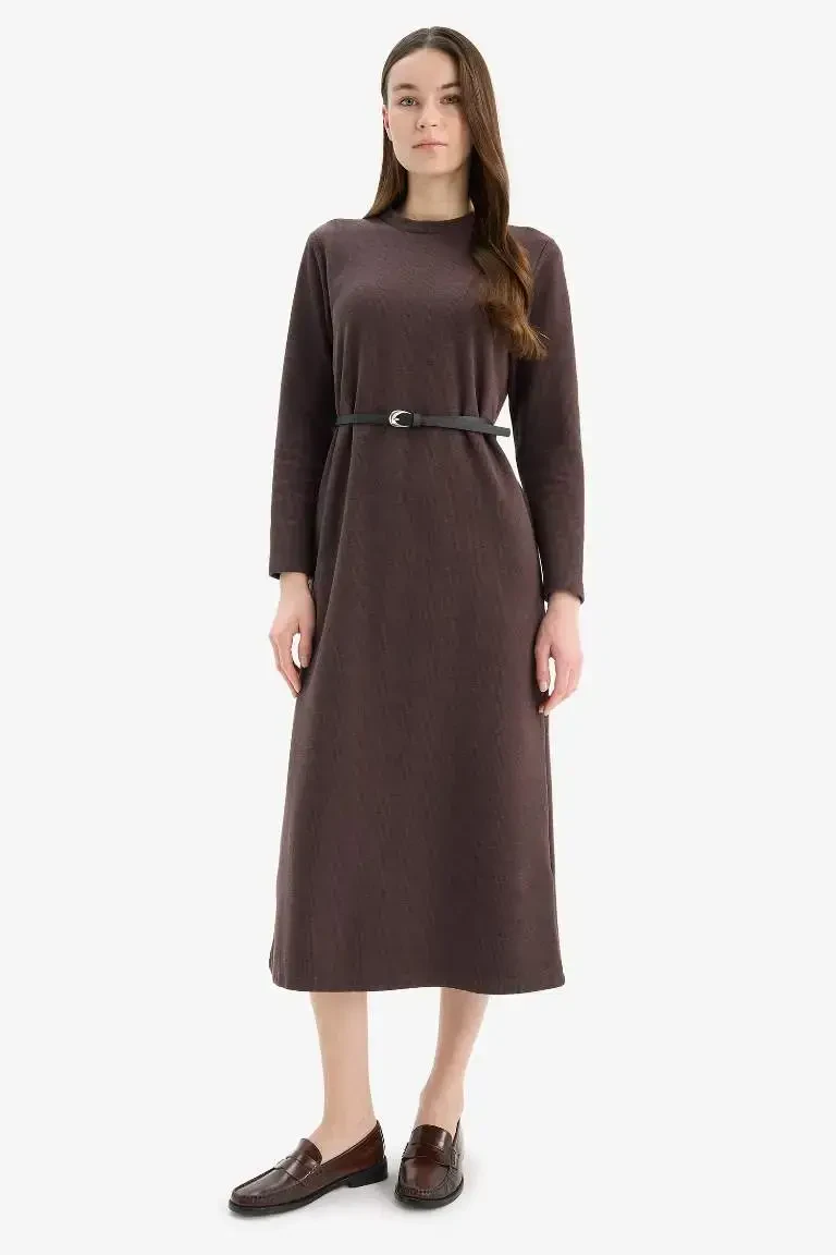 Платье миди кофейного цвета из ткани "салоники" с длинными рукавами, поясом, базового прямого кроя и воротником-стойкой regular fit – это универсальная вещь, сочетающая в себе элегантность и комфорт, которая должна быть в гардеробе каждой женщины. Современный дизайн с воротником-стойкой, элегантные длинные рукава и длина миди идеально подходят как для повседневной носки, так и для особых случаев. Одной из самых важных особенностей, отличающих это платье, является облегающий крой regular fit. Этот крой мягко повторяет линии тела, создавая приятный силуэт. Пояс подчеркивает талию, придавая женственный вид и завершая общую эстетику платья. Уникальная текстура ткани "салоники" придает платью особый вид и оставляет приятные ощущения на коже. Эта ткань известна своим элегантным внешним видом и удобством в носке. Теплый и естественный оттенок кофейного цвета подходит для любого тона кожи, позволяя вам чувствовать себя уверенно в любой обстановке. Создайте спортивный и элегантный образ с повседневным сочетанием или дополните свой элегантный образ туфлями на каблуках для особого случая – это платье всегда будет правильным выбором. Базовый прямой дизайн позволяет легко сочетать его с различными аксессуарами. Вы можете персонализировать свой стиль с помощью шалей, ожерелий, ремней и сумок. Длинные рукава позволяют носить его с комфортом в прохладную погоду. Длина миди придает образу современность и элегантность. Это платье не только выглядит элегантно, но и позволяет свободно двигаться. Ткань "салоники" обеспечивает комфорт в течение всего дня, не раздражает кожу и предотвращает потоотделение благодаря своей дышащей структуре. Прочная ткань платья подходит для длительного использования и не изнашивается легко. Кофейный цвет – это практичный выбор, так как он не пачкается и прост в уходе. Это платье, которое станет незаменимой частью вашего гардероба, можно с комфортом носить в любое время года. Если вы хотите подчеркнуть свою элегантность и комфорт как в повседневной жизни, так и в особых случаях, то платье миди кофейного цвета из ткани "салоники" с длинными рукавами, поясом, базового прямого кроя и воротником-стойкой regular fit – это то, что вам нужно!