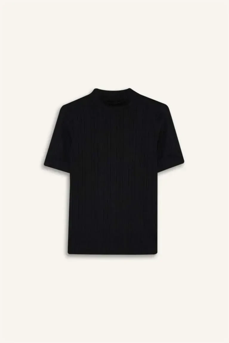 Yarım balıkçı yaka tasarımı, şık ve farklı bir görünüm sunarken, fitilli kaşkorse detayı sportif bir dokunuş katıyor. Kısa kolları ve regular fit kesimi, hareket özgürlüğü sağlarken, siyah rengi sayesinde her türlü kombine kolayca uyum sağlar.