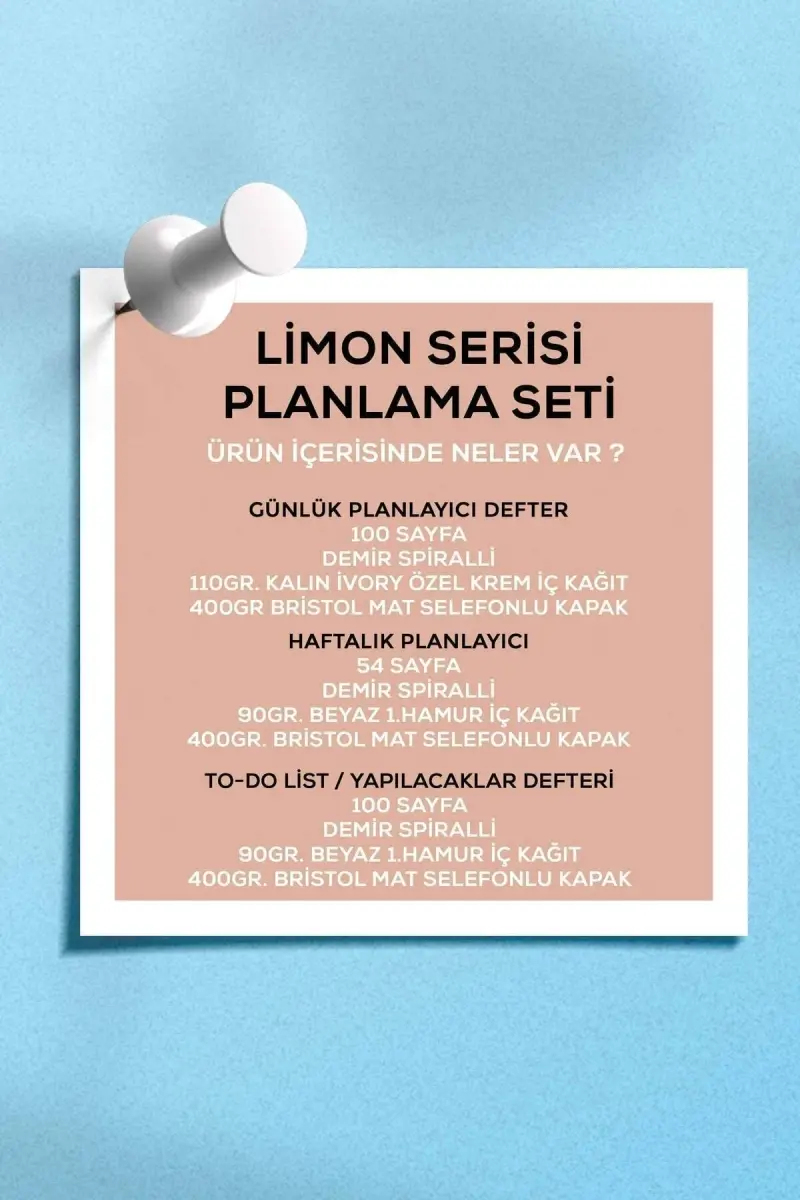 Apeirona tomonidan sinchkovlik bilan tayyorlangan Rejalashtirish to'plami bilan hayotingizni tartibga solish va unumdorligingizni oshirish vaqti keldi! Ushbu maxsus to'plam kundalik, haftalik rejalaringizni tuzishingiz va muhim yozuvlaringizni olishingiz mumkin bo'lgan uchta alohida daftardan iborat. To'plamga quyidagilar kiradi: Haftalik rejalashtiruvchi, Kundalik rejalashtiruvchi va Vazifalar ro'yxati / Esda tutish daftar. Limon-Limon mavzusida ishlab chiqilgan ushbu to'plam ham funktsional, ham ko'zni qamashtiruvchi ko'rinishni taqdim etadi. Uni o'zingiz uchun oling yoki yaqinlaringizga sovg'a qiling, ushbu rejalashtirish to'plami hayotingizga tartib va rang qo'shadi.Haftalik rejalashtiruvchi bilan butun haftangizni bir qarashda ko'rishingiz, uchrashuvlaringizni, yig'ilishlaringizni va muhim tadbirlaringizni osongina rejalashtirishingiz mumkin. Har bir sahifada yilning bir haftasi uchun ajratilgan joy tufayli, yil davomida muntazam ravishda rivojlanishingiz mumkin. Sahifalar orqasiga eslatmalar yozib, haftangiz haqidagi qo'shimcha ma'lumotlarni ham saqlashingiz mumkin.Kundalik rejalashtiruvchi daftar bilan har bir kun uchun maxsus batafsil rejalarni tuzishingiz mumkin. Kun davomidagi maqsadlaringizni belgilashingiz, ustuvorliklaringizni tartiblashingiz va kun oxirida nimaga erishganingizni ko'rib chiqishingiz mumkin. Ushbu daftar kuningizni yanada samarali o'tkazishga va maqsadlaringizga erishishga yordam beradi.Vazifalar ro'yxati / Esda tutish daftar esa tez yozuvlar olish, xaridlar ro'yxatini tuzish yoki xayolingizga kelgan fikrlarni yozib olish uchun idealdir. Sumka o'lchami tufayli uni doimo o'zingiz bilan olib yurishingiz va kerak bo'lganda har doim foydalanishingiz mumkin. Vazifalar ro'yxatingizni ustuvorlashtirib, muhim ishlaringizni kechiktirmay yakunlashingiz mumkin.Ushbu to'plam yuqori sifatli materiallardan tayyorlangan. Daftarlarning muqovalari 400gr. laminatlangan Bristol muqovasi bo'lib, suvga chidamli. Ichki sahifalar esa turli xil og'irlikdagi (90gr va 110gr) 1-sinf qog'oz yoki fil suyagi rangidagi qalin fil suyagi ichki qog'ozdan iborat. Chelik spirallar tufayli sahifalarni osongina aylantirishingiz va daftarlardan qulay foydalanishingiz mumkin.Rejalashtirish to'plami bilan yanada tartibli, yanada samarali va yanada muvaffaqiyatli hayotga qadam qo'ying. Unutmang, yaxshi rejalashtirish har doim muvaffaqiyatga eltuvchi yo'lda muhim qadamdir.