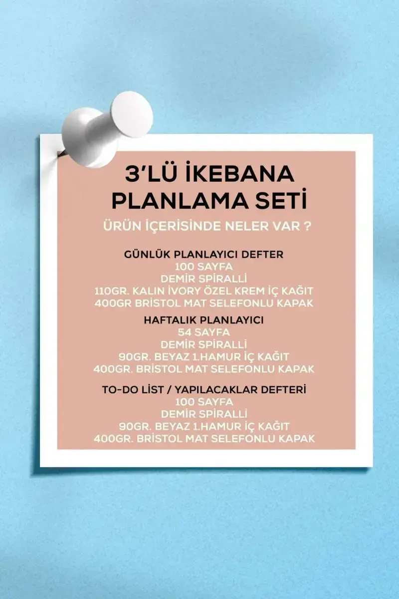 Rejalashtirish to'plami o'zining sodda va zamonaviy dizayni bilan har qanday yoshdagi va har qanday kasbdagi odamlarga yoqadi. Foydalanish oson, amaliy va funktsional tuzilishi bilan kundalik hayotingizni osonlashtiradi. O'zingizni va vaqtingizni yaxshiroq boshqarish, maqsadlaringizga erishish uchun ideal vosita.
