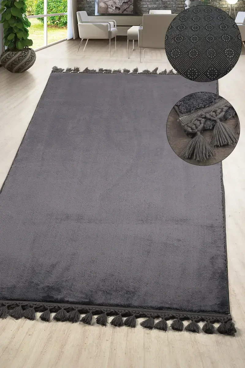 Antrasit Saçaklı Yolluk Halı | Leke Tutmaz, Kaymaz Taban, Yıkanabilir | Modern Tasarım