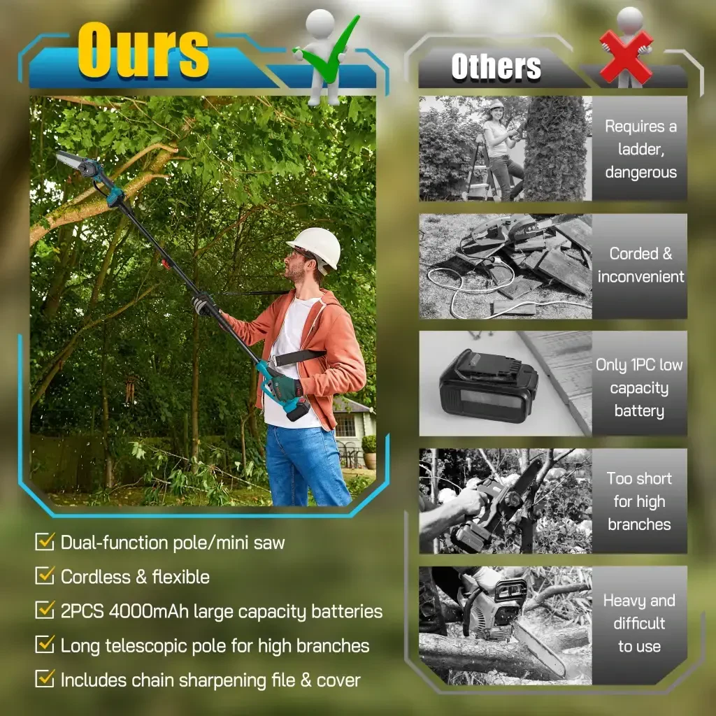 akkumulyatorli teleskopik arra, daraxt butash, zanjirli arra, butash arralari, akkumulyatorli arra, teleskopik arra, bog 'asboblari, RELOIVE, uzaytiriladigan arra, 2'si 1 da arra