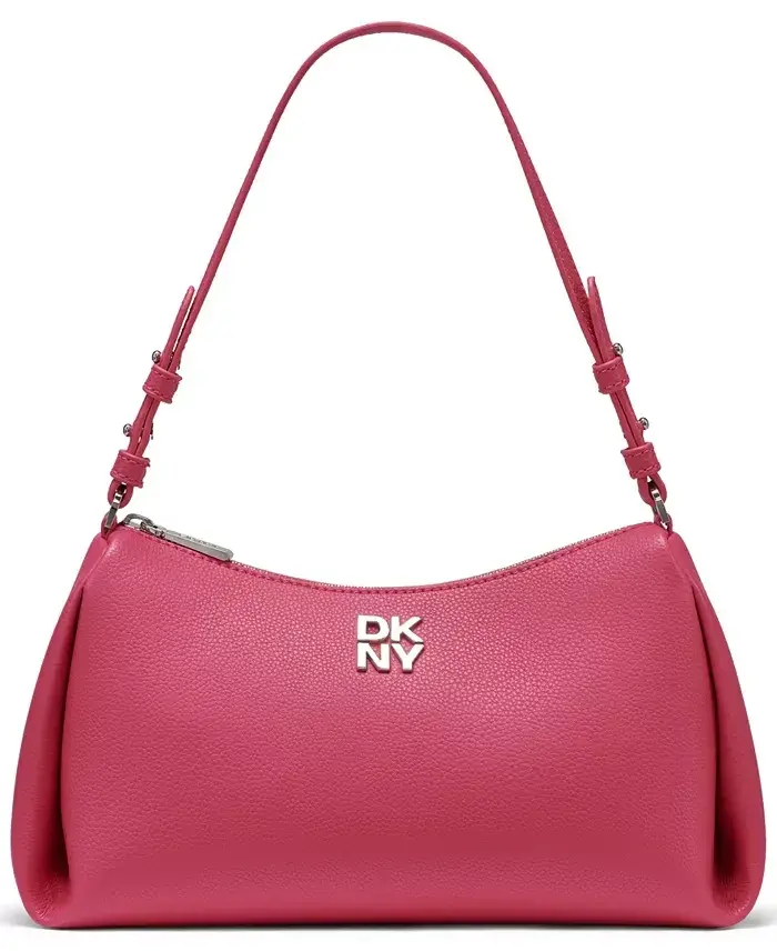 This easy, top-handle style from DKNY is designed to keep your small essentials secure and close without the fuss of carrying a larger bag. Medium-sized bag; 13"W x 6"H x 4-3/4"D (width is measured across the bottom of handbag); 0.6 lb. approx. weight Silhouette is based on 5'9" model 9"L adjustable strap Zipper closure Exterior hardware and logo; interior slip pockets Tablet compatible (std. size 8"-10") Body and trim: 100% polyurethane; lining 100% polyester Spot clean Imported