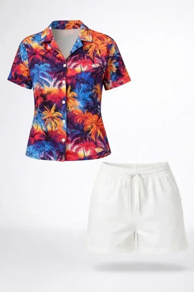Renkli Tropikal Palmiye Desenli Kısa Kol Gömlek Şort Takım Yazlık Rahat Kalıp - Desenli