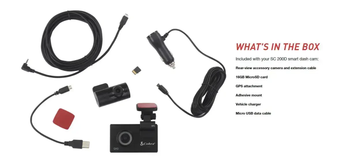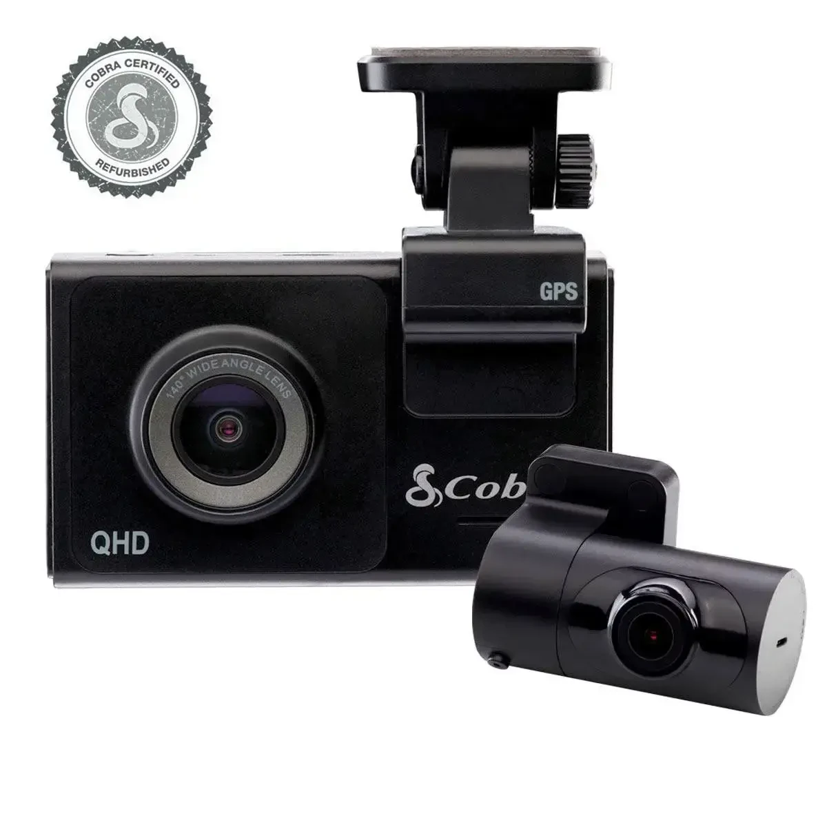 Cobra SC 200D QHD 1600P WiFi GPS Smart Dash Cam (Renewed) is an ideal solution for drivers who need the flexibility to record and monitor multiple camera views, including front and rear. This renewed product has been thoroughly tested and repaired to offer you an experience close to new product quality. The SC 200D includes the main SC 200 camera and the rear view accessory camera. The front camera captures every detail day or night with Quad HD video quality, while the rear camera offers Full HD resolution. The sleek 3" QHD OLED screen allows you to view recordings more clearly. Hands-free dash cam operation with voice commands, lane departure warnings, and collision warning assistant provides the safest and smartest driving experience for you and your loved ones. Built-in WiFi with Cloud-Based Video Management allows you to instantly save, edit and share footage from anywhere. Integrated GPS synchronizes location and speed information, ensuring you have critical information when you need it. With the Accident Reports and Emergency Alerts feature, you can instantly share your policy number, incident details, and videos from your dash cam to your insurance company. In the event of a serious accident, the emergency alert automatically sends a text message to your emergency contact. Safety features like continuous loop recording, emergency alert, Parking Mode and Motion Detection provide maximum protection. Advanced Driver Assistance alerts you if you drift or rapidly approach an object with lane departure and forward collision warnings. Supercapacitor technology allows Cobra SC smart dash cams to withstand the coldest and most intense temperatures. Dual-Band Wi-Fi Connection provides a flawless connection to the cloud and you will receive automatic software updates and alerts via dual-band Wi-Fi. With Cloud Video Management, you can instantly store, edit and share your footage from anywhere with built-in Wi-Fi and have instant access to your videos. Receive notifications of red light and speed camera locations and real-time shared alerts from the driver community.