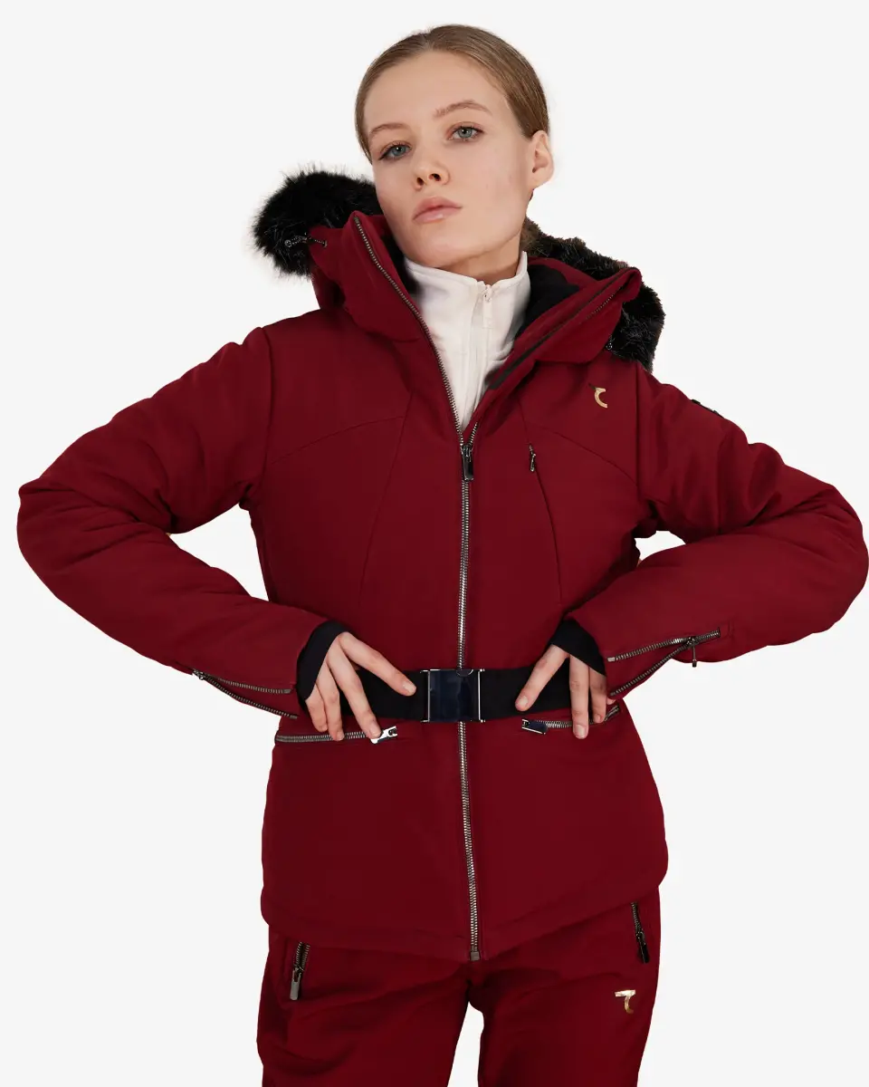 Ski suit, ski wear, RIDE ski suit, red ski suit, waterproof ski suit, windproof ski suit, fur-trimmed hood, ski fashion, ski clothing, women's ski suit