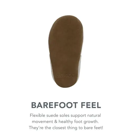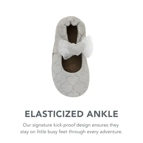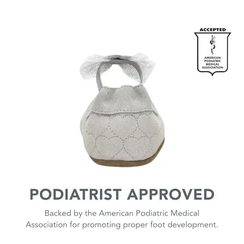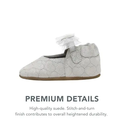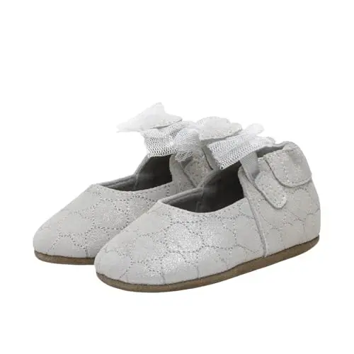 Robeez Baby Girls and Unisex Soft Soles slippers are designed to support the healthy development of tiny feet. These cute and practical slippers provide maximum comfort and safety for babies and toddlers as they take their first steps. Thanks to their soft soles that do not restrict the natural movements of the feet, they give the feeling of walking barefoot and help the tiny feet grow healthily. Robeez Soft Soles slippers flex and bend with every step, supporting the full range of motion of the feet. Suede soles make it easier for babies to grip the floor when they first start walking and provide enough space for the feet to grow comfortably. These slippers, which attract attention with their cute designs and characters, are ideal for both baby girls and boys. They are also approved by the American Podiatric Medical Association, which proves the quality and reliability of the product. Robeez slippers are easy to put on and take off, and their non-slip soles increase children's safety. The flexible ankle part or zipper ensures that it stays on the foot easily, and the non-slip suede sole prevents children from slipping. The naturally breathable lining helps keep feet dry and cool. The wide toe box provides freedom of movement, and the zero-drop sole provides better balance and is non-restrictive. The Robeez Baby Girls Desiree model stands out with its stylish design. The luxurious glittery silver color, suede upper, and matching tulle ribbon offer an eye-catching look. The heart applique and quilted hearts all over the surface make this slipper even cuter. Robeez slippers are produced considering the delicate skin of babies and toddlers, prioritizing their comfort and safety. Ensure your baby takes their first steps safely with Robeez Soft Soles slippers. These slippers are not only a cute accessory but also an important tool that supports foot health.