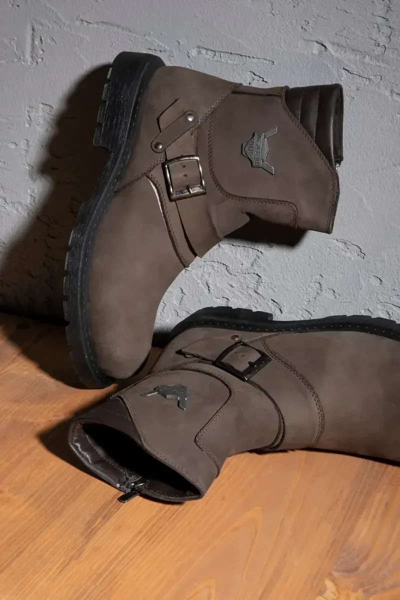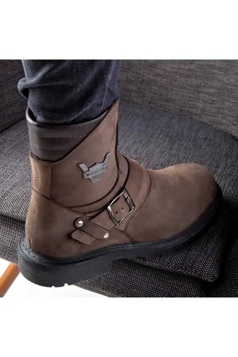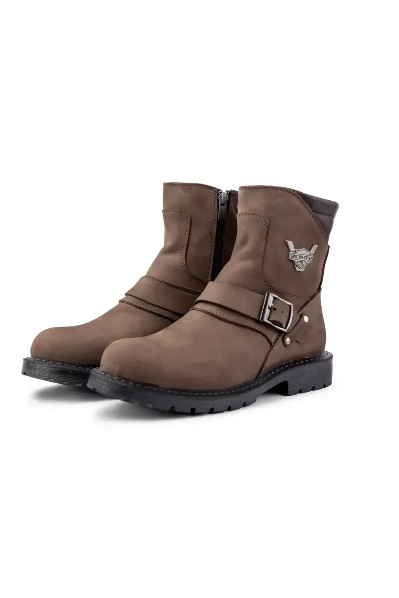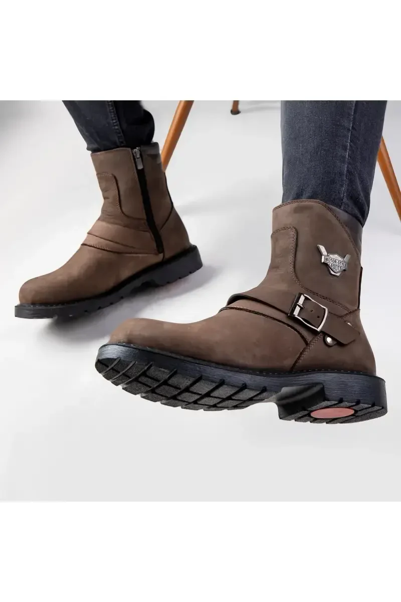 Hakiki Deri Erkek Kürklü Bot - Kahve Nubuk Harley Bot | Kışlık Bağcıksız Postal