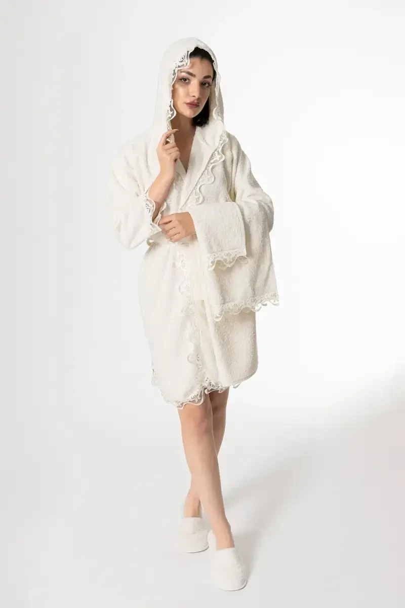 Add elegance and comfort to your wedding preparations with the Ender Home Rosa Bride Bathrobe Set. This 5-piece lace trousseau set will accompany you on your special days and in daily use. Made of 100% cotton yarn, it will complete your bathing pleasure with its soft texture and high water absorbency. This export-quality set is meticulously produced in our factory in Denizli. The Rosa Bride Bathrobe Set is not just a bathrobe set, but also a memento. You will feel special with its bathrobe decorated with special lace details, matching towels and slippers. You can choose the one that suits your taste with Beige, Cream, Purple and Pink color options. The set includes a bathrobe, 30x50 cm and 50x90 cm towels and stylish slippers, which will turn your bath routine into a luxurious experience. Moreover, it protects your health thanks to its antibacterial and antiallergic properties. This set, produced with Ender Home quality, is specially designed for long-lasting use. Its 380 gr/m2 cotton fabric complies with European and American quality standards. It has high washing resistance and can be easily washed in a 30 degree program and is suitable for tumble drying. Thanks to its special production technology, it is resistant to bacteria and odor formation. Produced in accordance with OEKO-TEX, SEDEX, BSCI, ISO 9001, ISO 14001, ISO 45001 and ISO 10002 standards, the Rosa Bride Bathrobe Set is a perfect gift option for both you and your loved ones. This set, which appeals to brides-to-be, newlyweds or those who want to make their loved ones happy on special occasions, offers elegance and usability together. Body sizes are offered as S/M and L/XL. For S/M size, bathrobe length is 95 cm, arm length is 45 cm, closed chest measurement is 50 cm. For L/XL size, bathrobe length is 98 cm, arm length is 46 cm, closed chest measurement is 55 cm. You can increase the softness and hygiene of the product by washing it before use. Pamper yourself with the Ender Home Rosa Bride Bathrobe Set and take your bathing pleasure to the next level.