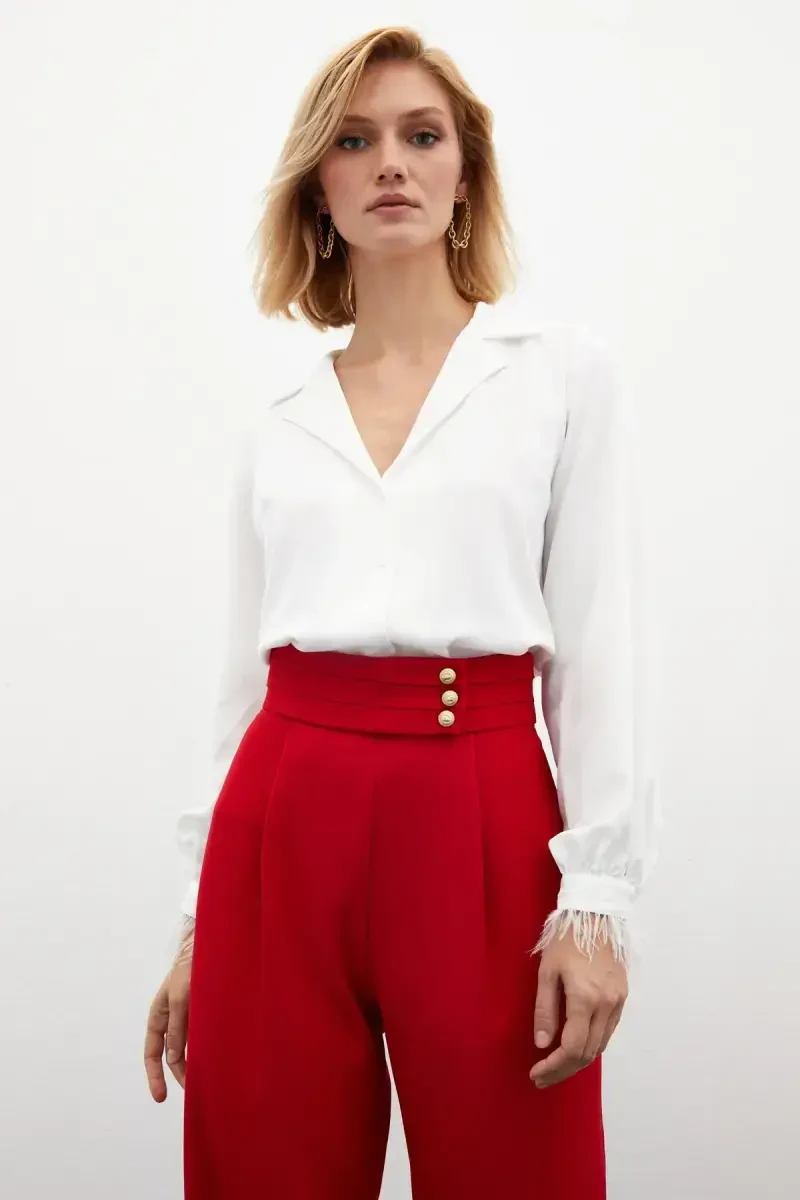 Рубашка свободного кроя с отделкой из перьев | Экрю Рубашка | Удобная и стильная рубашка