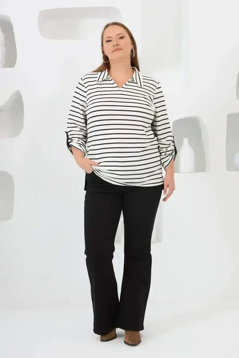 Объедините элегантность и комфорт в своем гардеробе с белым свитшотом большого размера в полоску с воротником рубашки. Этот свитшот специального дизайна — идеальный выбор для женщин больших размеров, которые любят комфорт и не хотят жертвовать своим стилем. Деталь с воротником рубашки придает свитшоту другой вид, а полосатый узор создает современный и динамичный образ. Этот свитшот, который можно с легкостью носить как в повседневной жизни, так и в особых случаях, сочетает в себе элегантность и комфорт.Этот свитшот, изготовленный из высококачественного материала, рассчитан на длительное использование. Благодаря содержанию хлопка 95% он позволяет вашей коже дышать и обеспечивает комфорт в течение всего дня. 5% эластана увеличивают эластичность изделия и не ограничивают вашу свободу движений. Трикотажная ткань придает свитшоту мягкость и позволяет вам чувствовать себя хорошо, как только вы его надеваете.Длина свитшота 44 размера на модели составляет 80 см, что обеспечивает современный и практичный вид. Эта длина позволяет создавать различные комбинации. Вы можете с легкостью сочетать его с леггинсами, джинсами или юбками и создать образ, соответствующий вашему стилю.Этот свитшот, который станет незаменимым в осенние и зимние месяцы, не позволит вам пожертвовать своей элегантностью, согревая вас. Благодаря белому цвету он легко сочетается с любыми цветами и моделями. Независимо от того, хотите ли вы создать спортивный образ или более элегантный стиль, этот свитшот будет сопровождать вас в любой ситуации. Подчеркните свой стиль и привлекайте внимание в любой обстановке с белым свитшотом большого размера в полоску с воротником рубашки. Обязательно попробуйте этот свитшот, чтобы чувствовать себя особенной и выглядеть стильно, не жертвуя своим комфортом. Этот продукт, который является кандидатом на то, чтобы стать самым любимым предметом вашего гардероба, будет сопровождать вас как в повседневной жизни, так и в особые моменты.