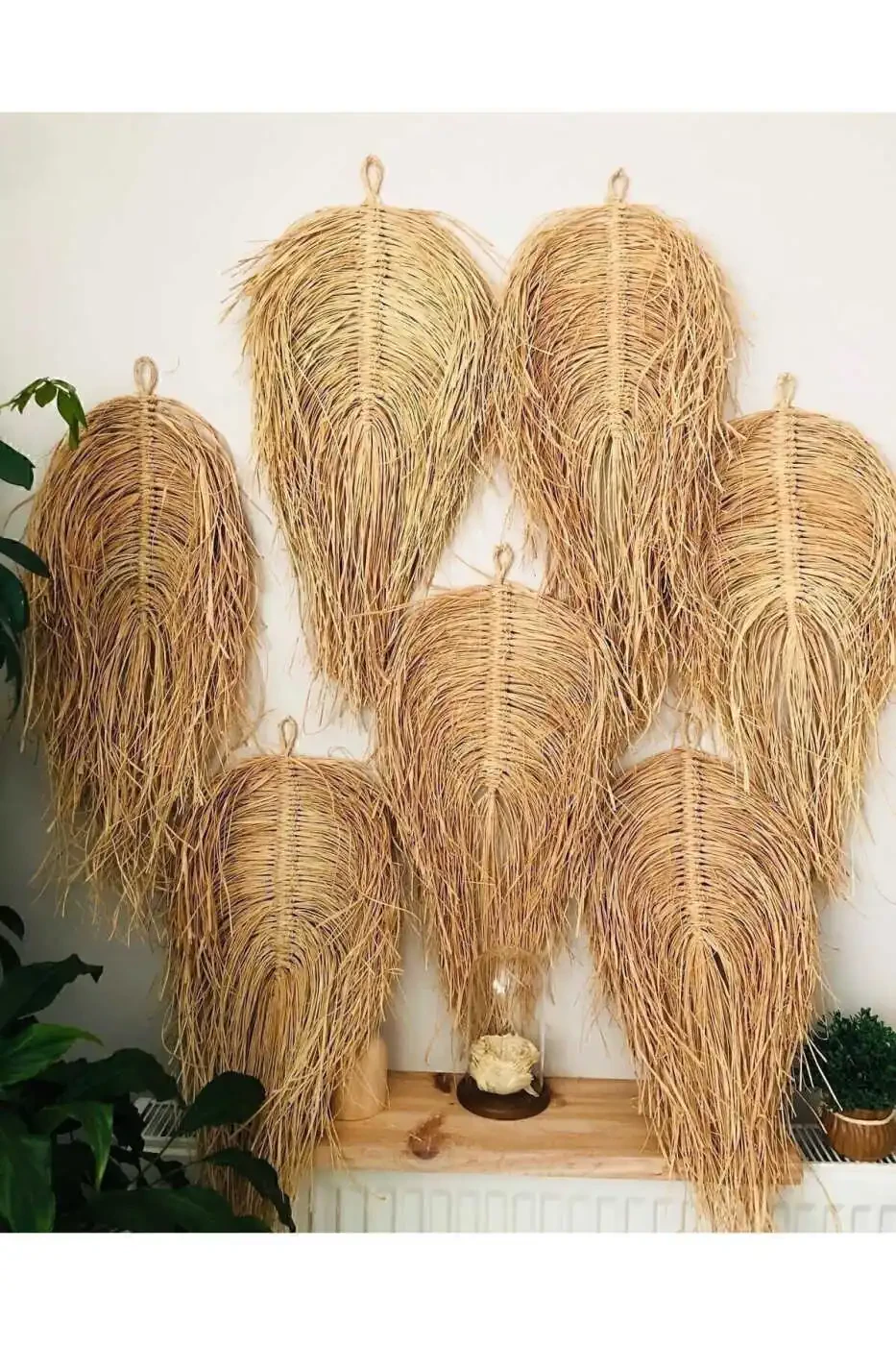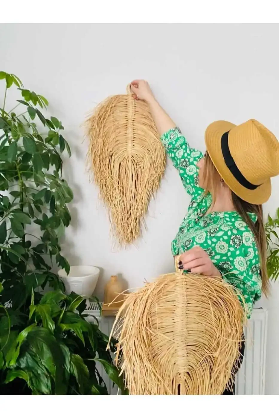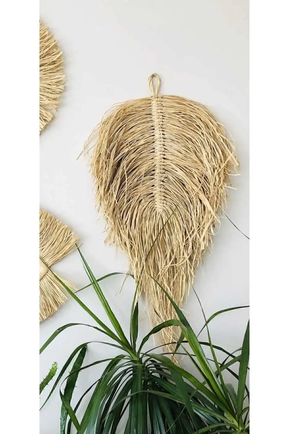 Ручная работа декорация из листьев рафии - идеальный выбор для добавления естественного и богемного шарма в ваш дом, придавая тепло и эстетичный вид вашим жилым помещениям. Этот декоративный продукт, тщательно изготовленный из натуральных листьев рафии, предлагает уникальный дизайн, добавляя стильный вид вашим стенам или дверям.