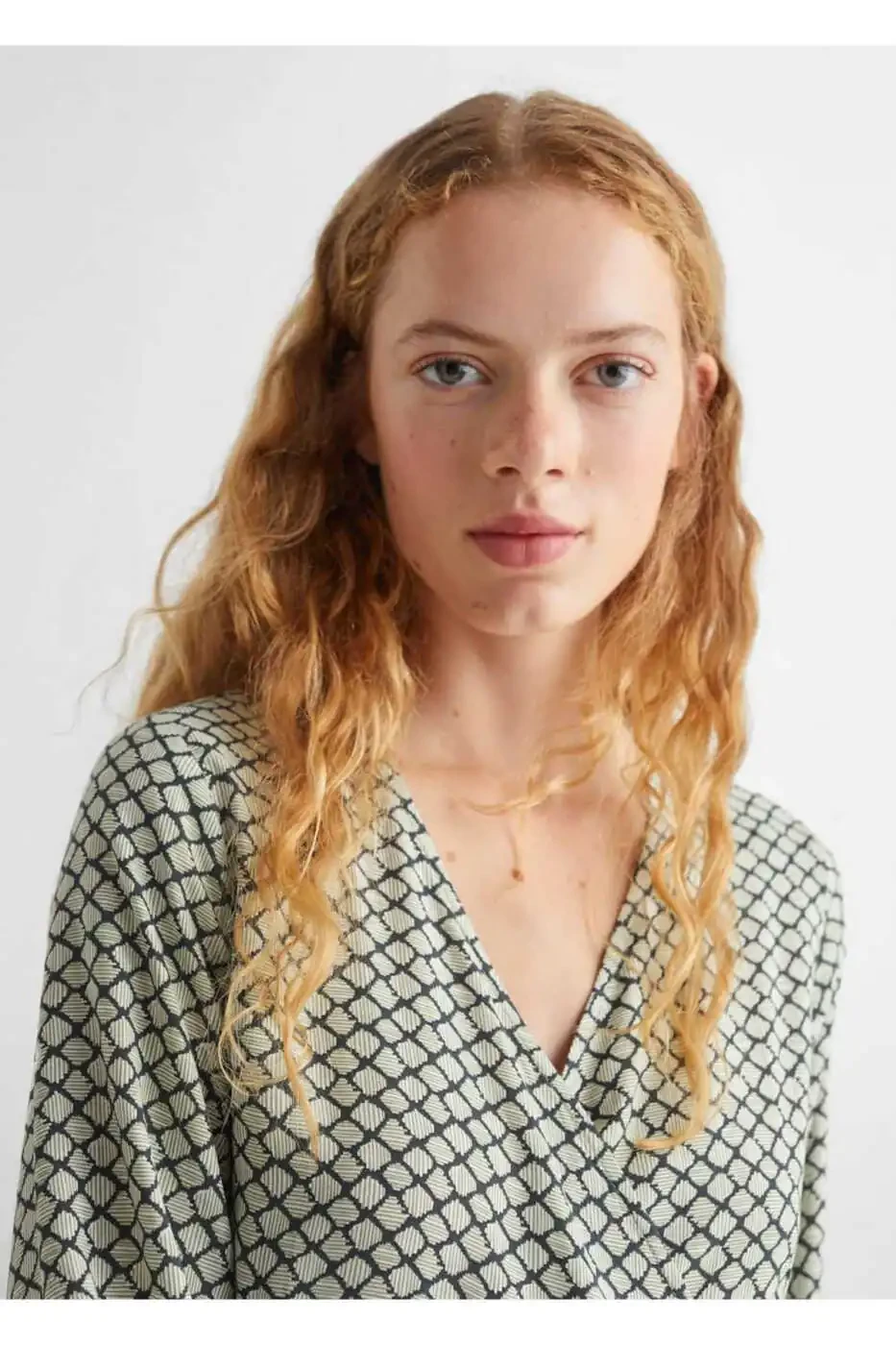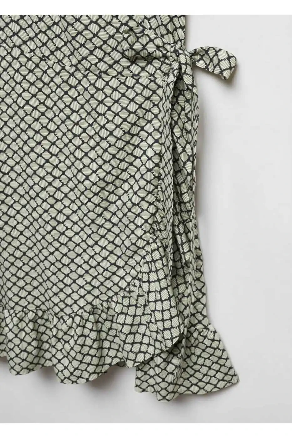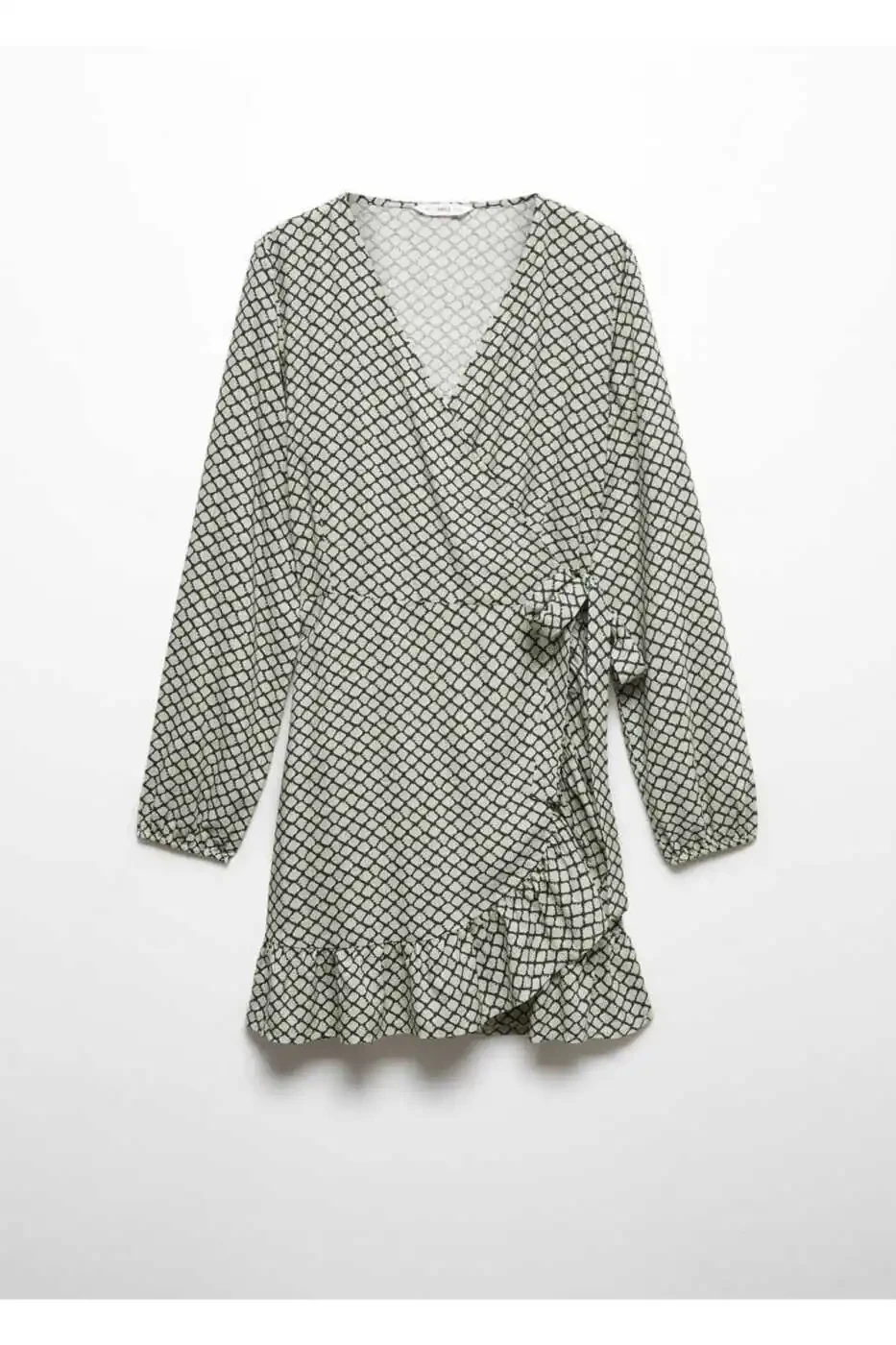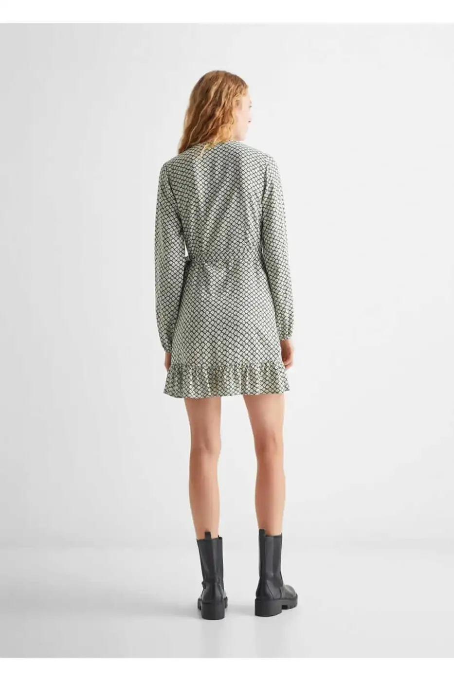 The ruffled dress is a stylish and elegant piece that every woman should have in her wardrobe. Its short length and envelope cut detail offer a feminine look, while the ruffle details add movement and vibrancy to the dress. With its V-neck and long sleeves, the dress creates a classic style, while the tie detail adds a modern touch.