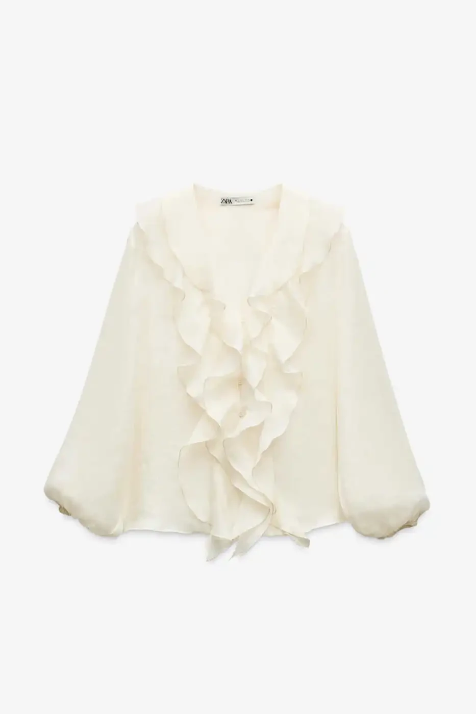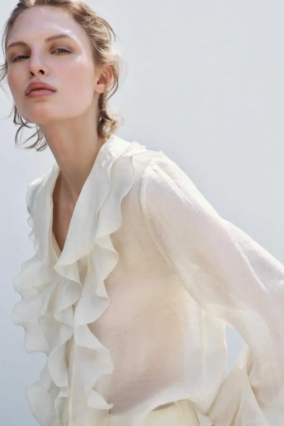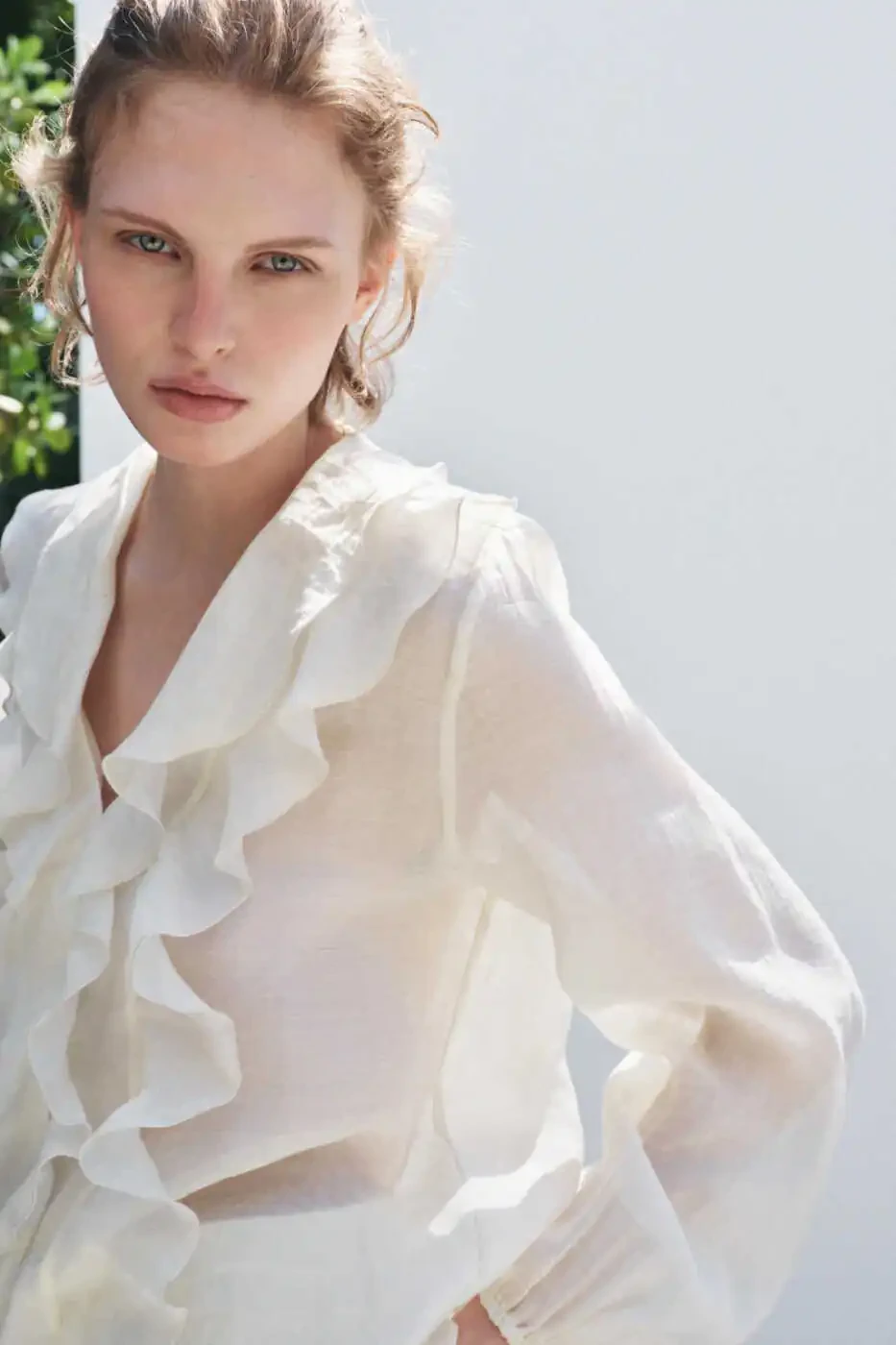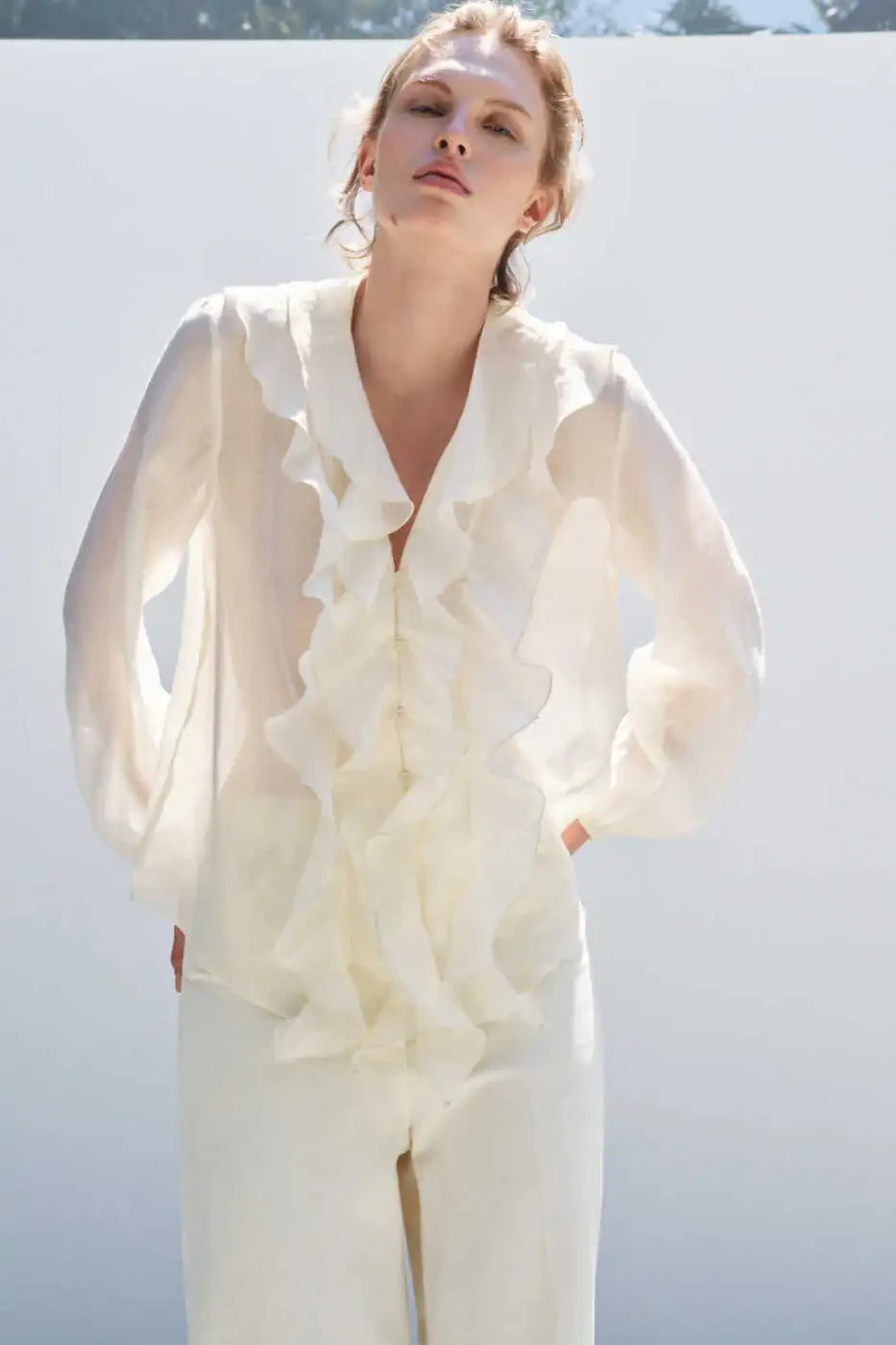 RUFFLED SHIRT ZW COLLECTION - Ecru, a candidate to be one of the indispensable pieces of your wardrobe, carrying the elegant and modern lines of Zara Woman Collection. Being produced from lyocell yarn provides this shirt with a unique softness and lightness, while also allowing you to make an environmentally friendly choice. The V-neck design offers a feminine touch, while the elasticated and long-sleeved structure prioritizes comfort. The gathered details on the sleeves add movement and dynamism to the shirt, taking it away from ordinariness. Ruffle details bring elegance and grace together, allowing you to stand out in any environment. Front button fastening offers ease of use and adds a modern touch to the overall design of the shirt. This shirt is a versatile piece that you can easily prefer for both daily use and special occasions. Whether you combine it with jeans for a sporty look or combine it with skirts or trousers to create a more stylish style. RUFFLED SHIRT ZW COLLECTION - Ecru will complement your style and give you confidence in all situations. The natural texture of the lyocell fabric allows your skin to breathe and makes you feel comfortable all day long. The ecru color of the shirt is compatible with all kinds of combinations and can be easily paired with other pieces in your wardrobe. This shirt not only offers a stylish look, but also offers a long-lasting use experience thanks to its quality material and workmanship. This special design of Zara Woman Collection reflects the stylish and conscious preferences of the modern woman. Always feel stylish, comfortable and confident with RUFFLED SHIRT ZW COLLECTION - Ecru. This shirt will be one of the most loved pieces of your wardrobe and will accompany you for years. It is an ideal choice for women who are looking for elegance, comfort and quality together. This shirt, which contains care and elegance in every detail, will take your style to the next level and make you different in any environment. The ruffle details of the shirt create a lively and energetic look, while also adding a feminine and elegant air. This shirt is a versatile piece that will complement your style both day and night. This special design of Zara Woman Collection is a unique option that reflects the style of the modern woman.
