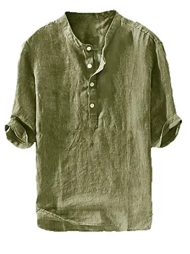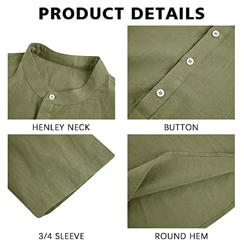 Erkak ko'ylak, zig'ir aralash, yozgi, yengil, plyaj, yoga, 3/4 yeng, Henley futbolka, normal kesim, Ryannology