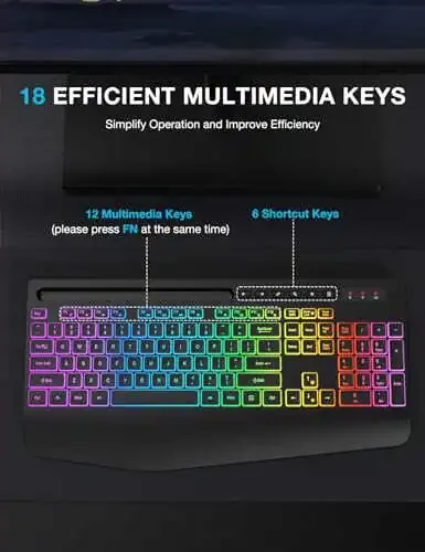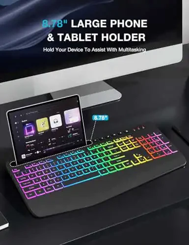 wireless keyboard, sablUTE, 9 backlit effects, wrist rest, phone holder, 2.4g lag-free, ergonomic, rechargeable, silent, computer, laptop, windows