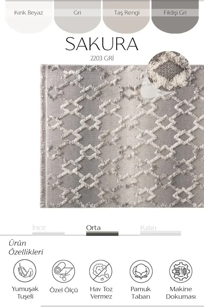 Sakura 2203 Grey Lint-Free Ethnic Patterned Modern Woven Boucle Salon Carpet is an excellent choice that will change the atmosphere of your home and add a modern and stylish touch. This carpet, which attracts attention with its ethnic patterns, creates a unique ambiance by bringing the nobility and elegance of gray tones to your living spaces. Produced with modern weaving technology, this carpet offers both visually impressive and long-lasting use.Product DescriptionSakura 2203 Grey carpet brings not just a carpet, but a work of art to your home. This carpet, where ethnic patterns meet modern weaving techniques, adds warmth and character to your living spaces. The serenity of gray and the dynamism of ethnic patterns come together to create balance and harmony in your home. You can use this carpet in your living room, sitting room or bedroom, and it easily adapts to all kinds of decorations. Thanks to its lint-free feature, it is an ideal choice for those with allergies and sensitive constitutions. Its boucle texture adds a different dimension to the carpet, while also helping you relieve the tiredness of the day by massaging your feet. Sakura 2203 Grey carpet is not just a floor covering, but also an element that increases your quality of life. With its modern design, durable structure and easy-to-clean feature, it will be an indispensable part of your home for many years. Discover the most stylish way to personalize your home with the contemporary interpretation of ethnic patterns. Add originality to your living spaces with Sakura carpet and impress your guests. This carpet is not just a decoration item, but also an expression of a lifestyle. The sophisticated stance of the gray color and the vibrancy of ethnic patterns allow you to create a unique atmosphere in your home. Sakura 2203 Grey carpet embodies quality and care in every detail. Whether furnished in modern or classic style, this carpet, which will suit every corner of your home, adds value to your living spaces.Product Features* Lint-Free: Ideal for those with allergies, minimizes dusting.* Ethnic Patterned: The harmony of modern and ethnic patterns adds a unique atmosphere to your home.* Modern Weaving: Offers long-lasting use with quality and durable weaving technology.* Boucle Surface: Relaxes your feet by massaging them and adds a different touch to the carpet.* Gray Color: A stylish and modern gray tone that adapts to all kinds of decorations.Additional InformationSakura 2203 Grey Lint-Free Ethnic Patterned Modern Woven Boucle Salon Carpet is very easy to clean. You can clean it regularly with a vacuum cleaner, and if there is a stain, you can benefit from professional carpet cleaning services. In order for the product to last longer, it is recommended to protect it from direct sunlight and not to keep heavy objects in the same spot for a long time.