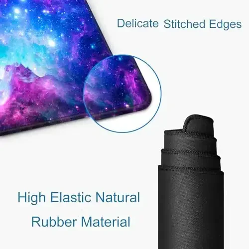 Yumshoq mato yuzasi va sirpanmaydigan kauchuk taglik. Bardoshli tikilgan qirralar. Kir yuvish mashinasida yuvish mumkin. Rang o'chishiga chidamli. Aniq sichqoncha nazorati. Keng maydon. Binafsha galaktika dizayni.