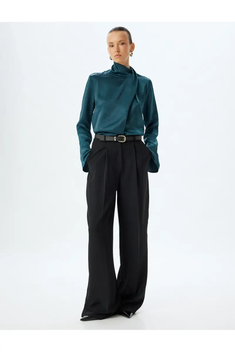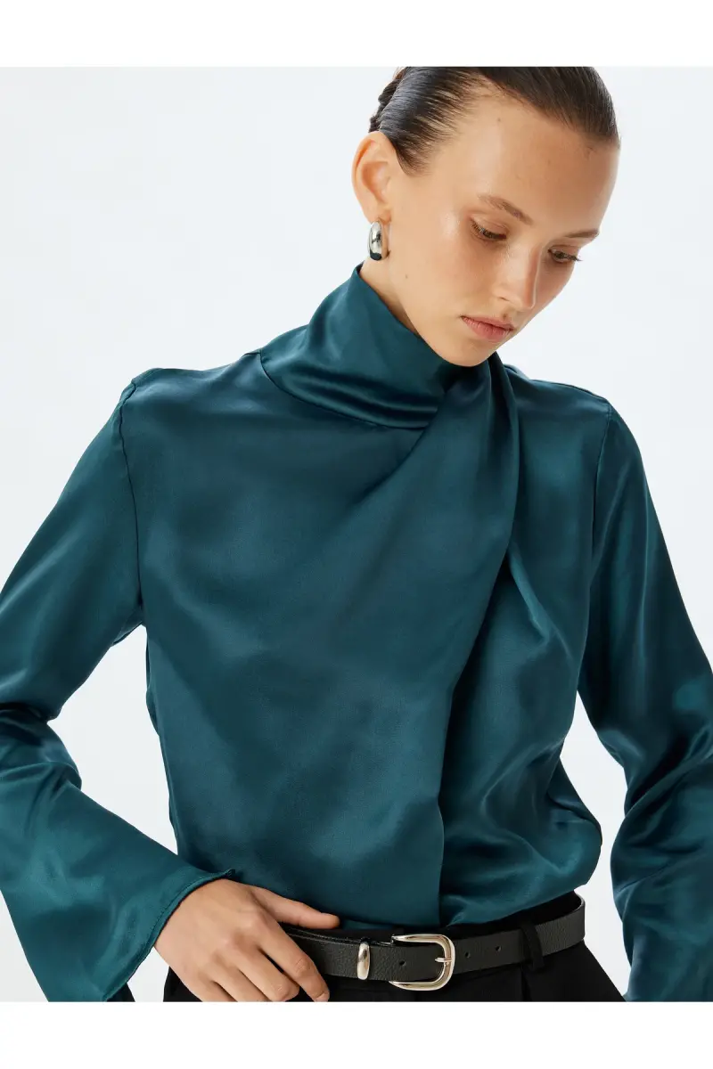 Saten Bluz Asimetrik Dik Yaka Drape Detaylı Uzun Kollu-Yeşil