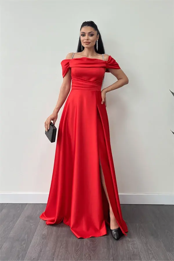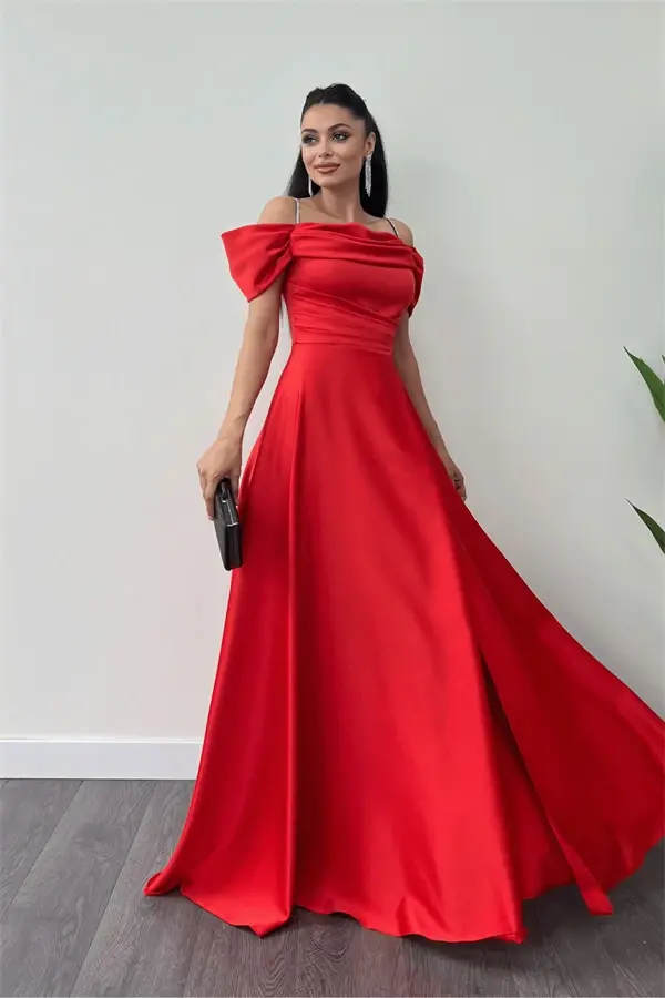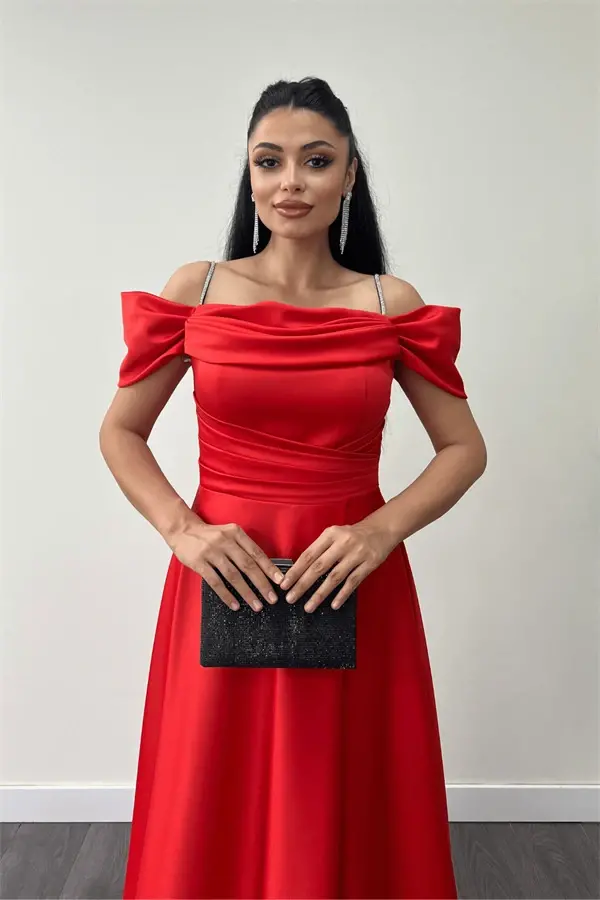 Saten Kumaş Büzgülü Askılı Abiye Elbise - KIRMIZI