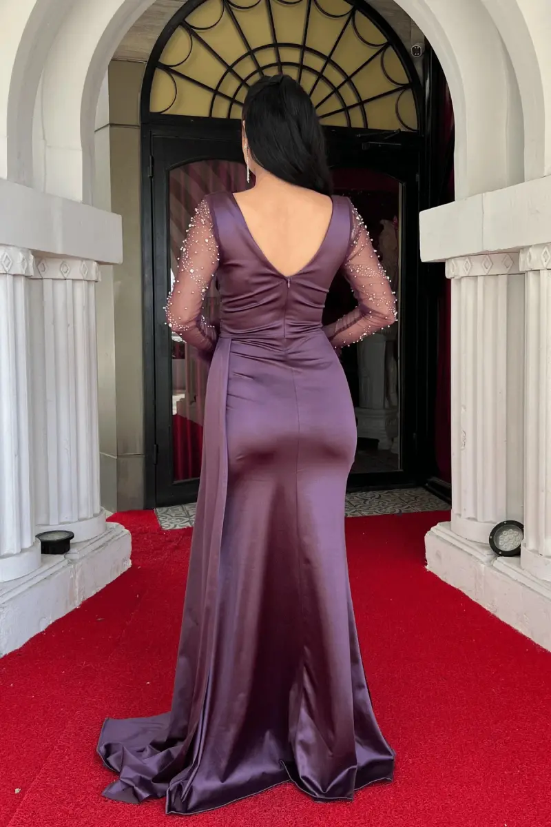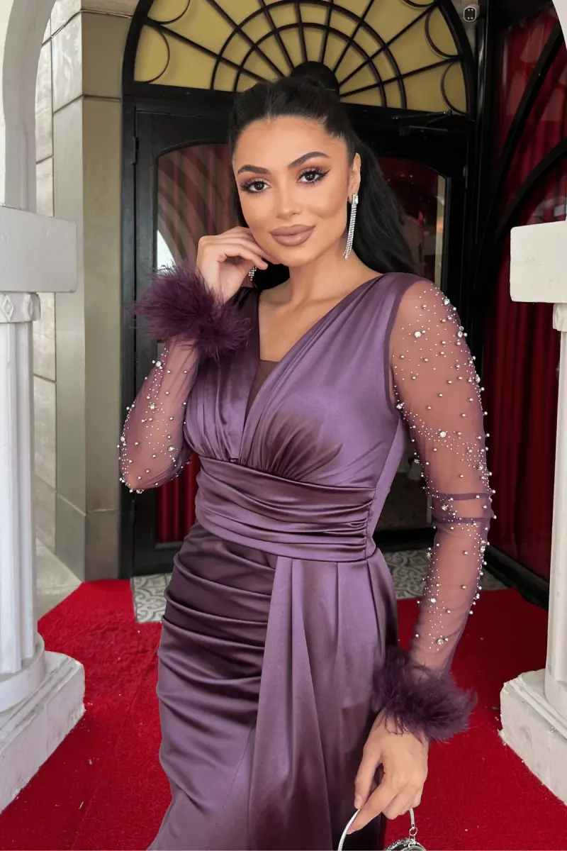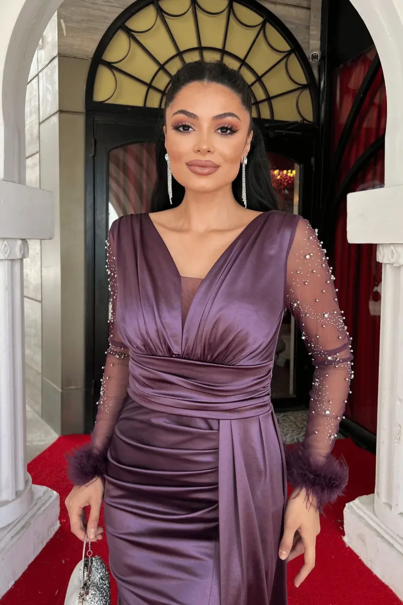 Saten Kumaş Kolları Otrişli Boncuk Detaylı Balık Elbise - LİLA-LİLA