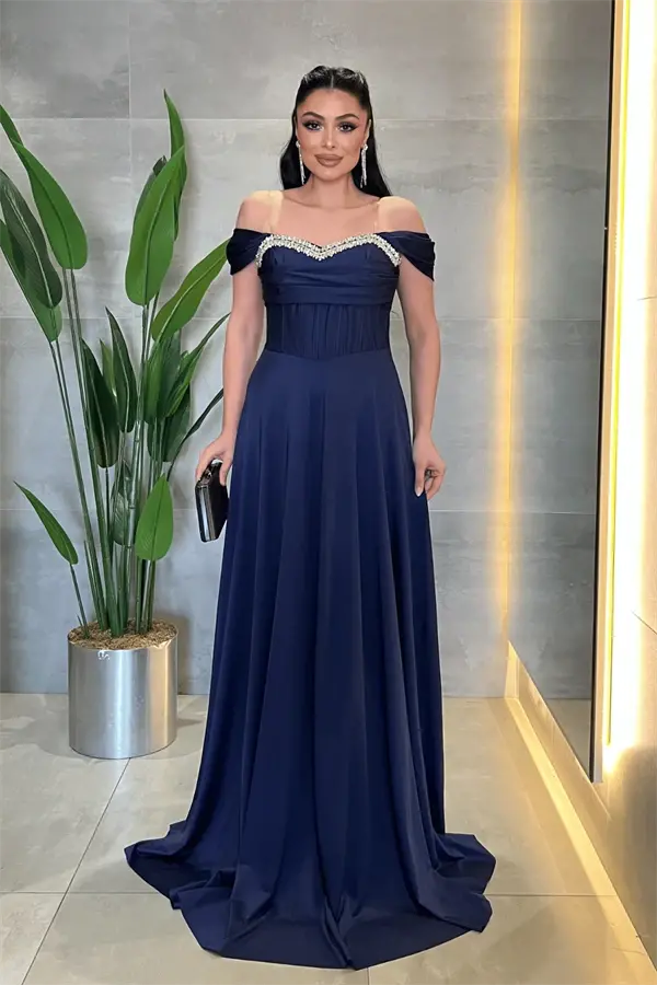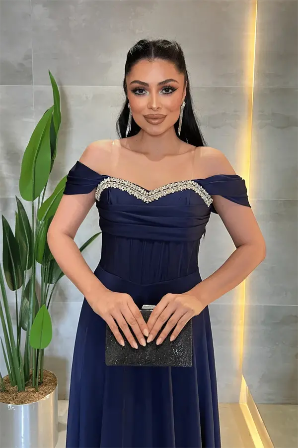 If you are looking for a sophisticated and eye-catching elegance that will highlight your grace on your special occasions, the Satin Fabric Boned Stone Detailed Evening Dress is perfect for you. Designed in the most noble and deep shade of navy blue, this unique piece will ensure you capture everyone's attention in any setting with its modern cut and remarkable stone details. The soft texture of the satin fabric and its light-reflecting shiny surface add a luxurious feel to the evening dress, while you will feel much more confident with its special fit that gently follows your body contours. The boned structure on the bust gives your body a perfect form, while strategically placed stone embellishments add a fascinating sparkle to the dress. This dress, which will be your go-to for weddings, engagements, and special invitations, offers all-day comfort thanks to its high-quality fabric structure. Thanks to the lining inside, it does not cause any transparency issues, ensuring you always feel secure. The supported structure in the chest area eliminates the need for extra underwear, allowing you to display a flawless posture. Offering practicality with its back zipper design, this model is a masterpiece that reflects the modern woman's sense of style. The aesthetic look displayed by the 1.68 cm tall model is the greatest proof of how elegantly the dress will fit your body. Produced as a full fit and having a slight stretch, this evening dress brings you together with elegance without restricting your range of motion. Make your mark on unforgettable memories with this navy blue satin evening dress, which is a candidate to be the most valuable piece in your wardrobe.