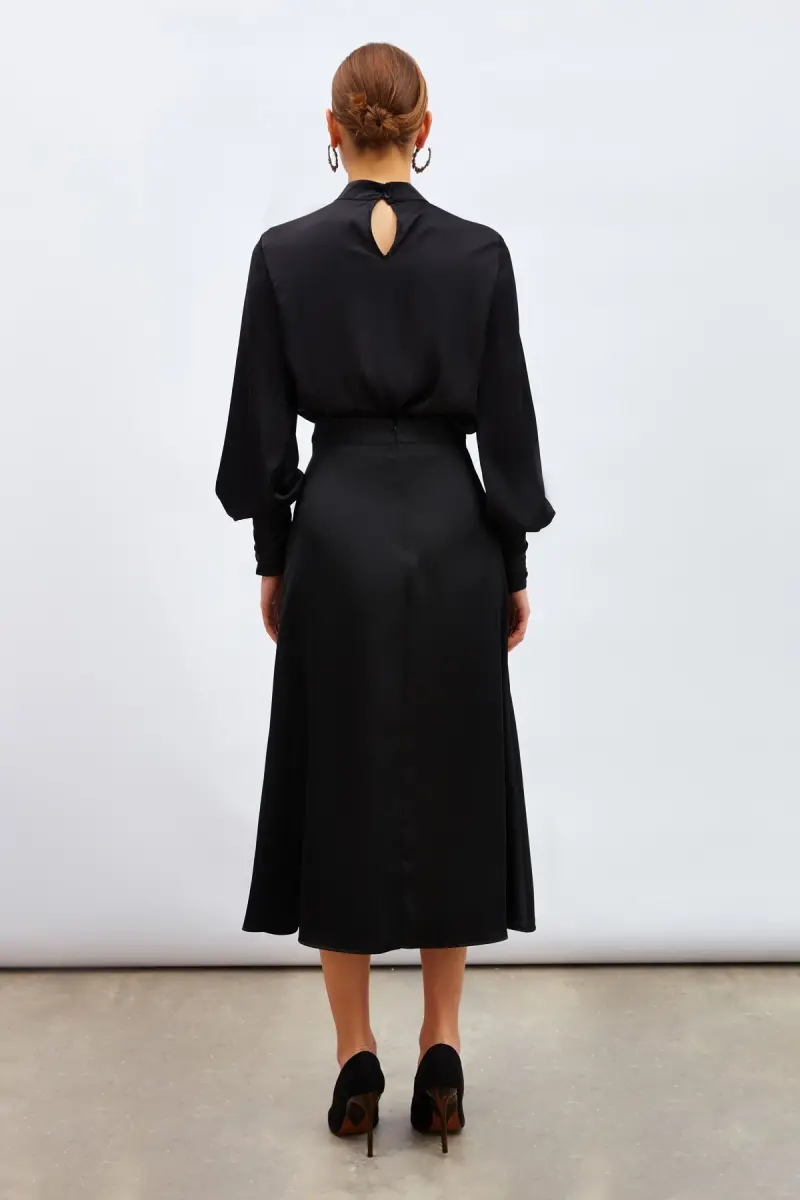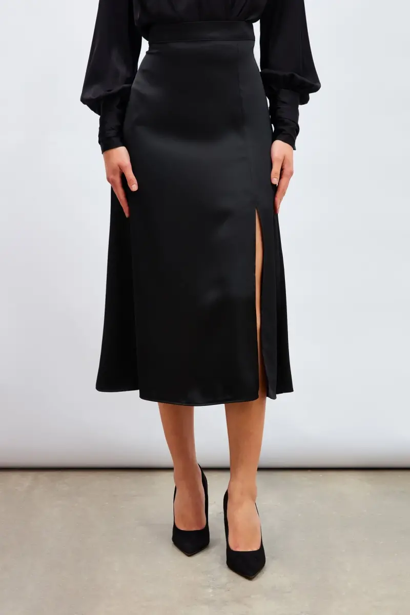 Combining elegance and style, the high-waisted midi-length satin skirt will be one of the indispensable pieces of your wardrobe. The skirt, which can be easily put on and taken off thanks to its back zipper design, offers a lively look with its slit detail. The unlined structure provides a comfortable wearing experience, the skirt is ideal for completing your combinations in every season.