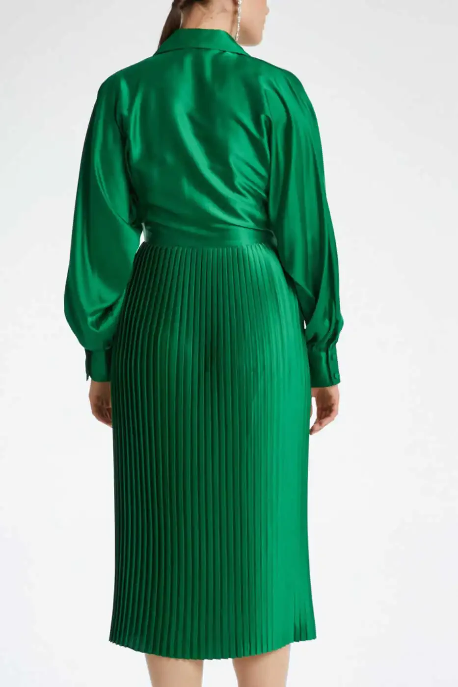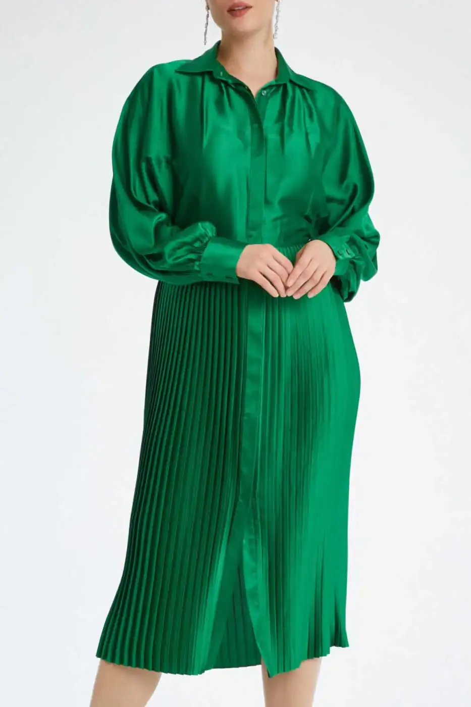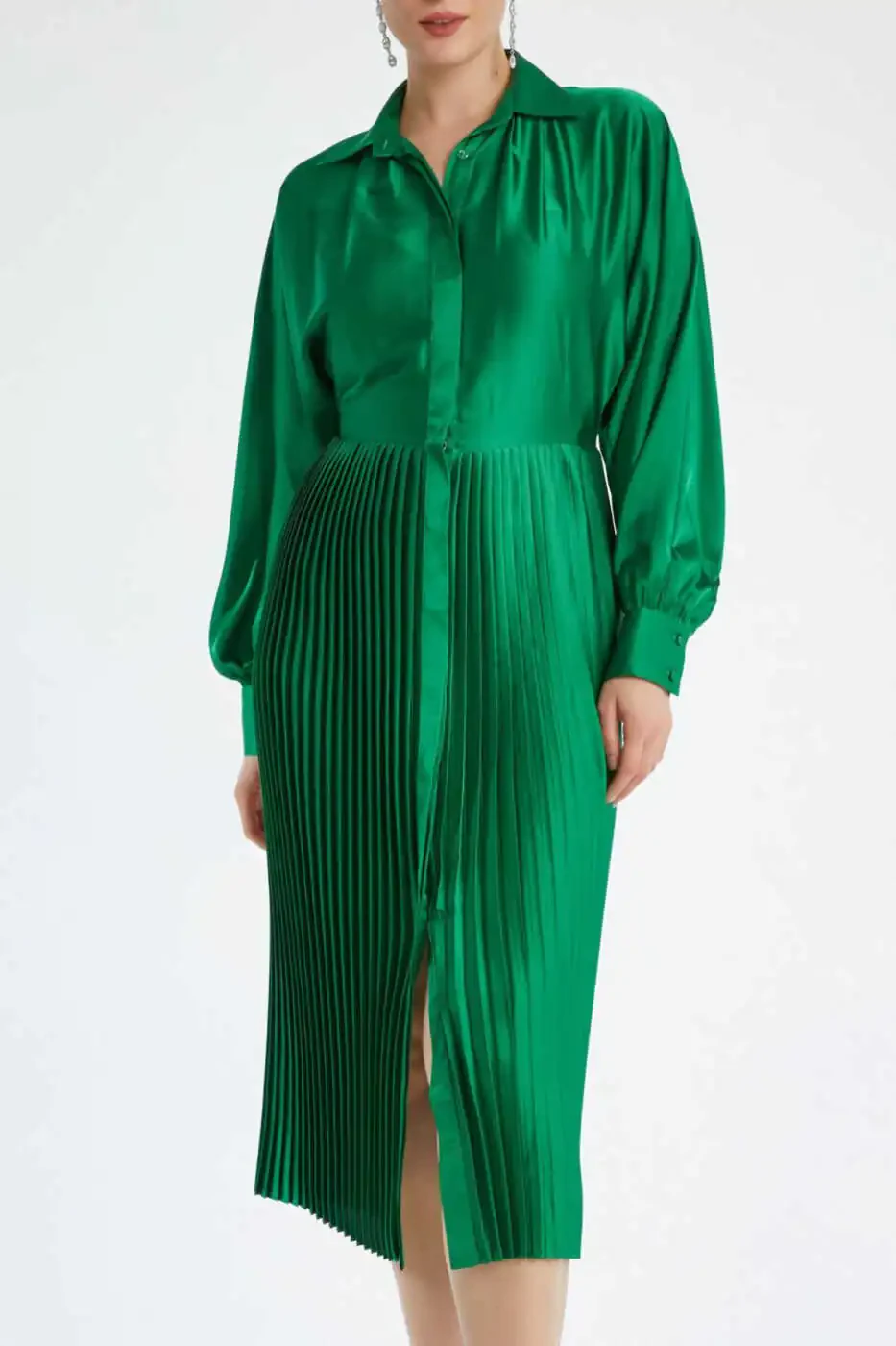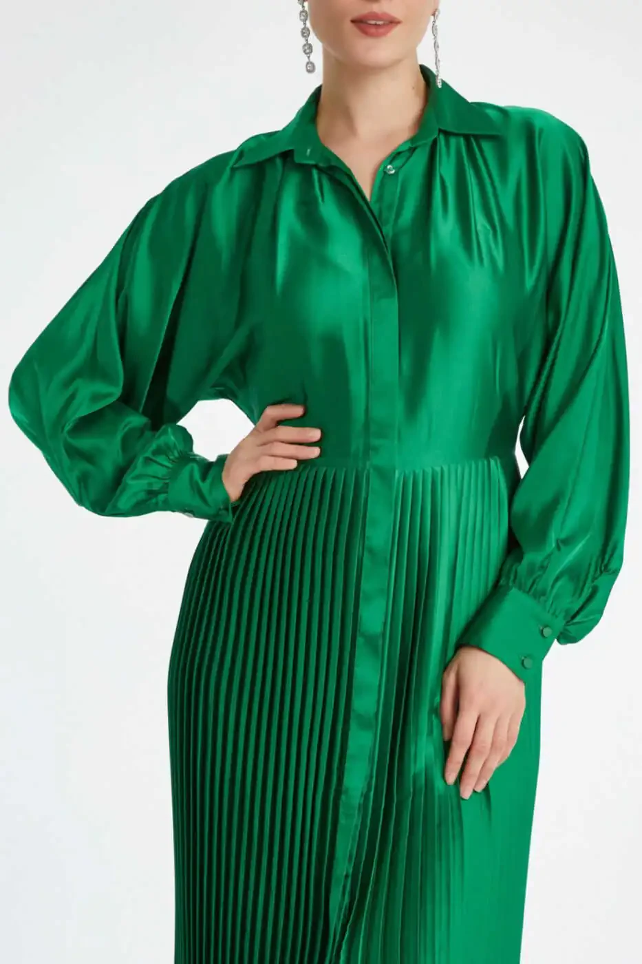 Атласное платье, платье миди, платье с воротником-рубашкой, плиссированное платье, зеленое платье, платье Serpil Exclusive