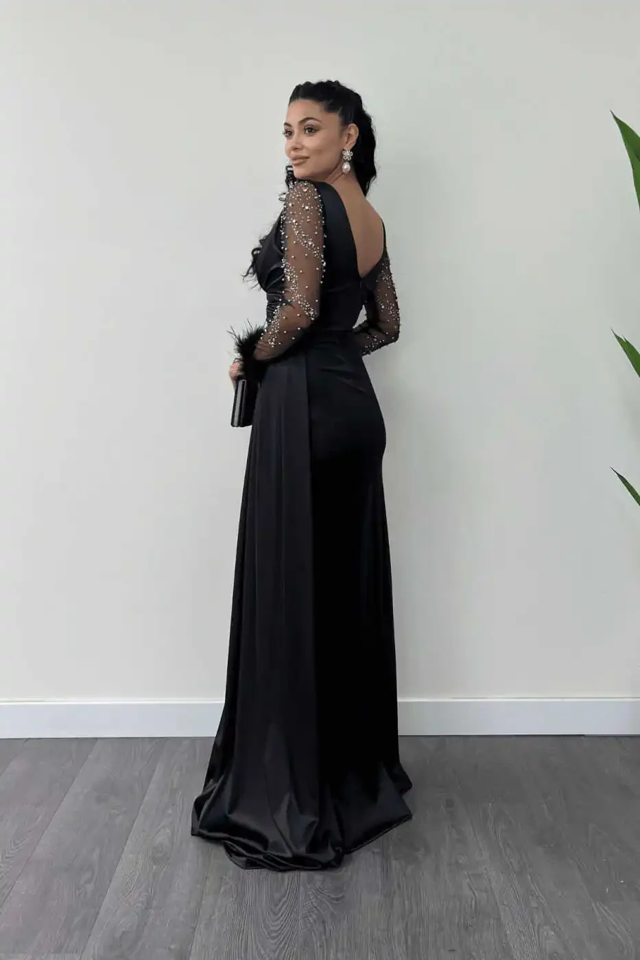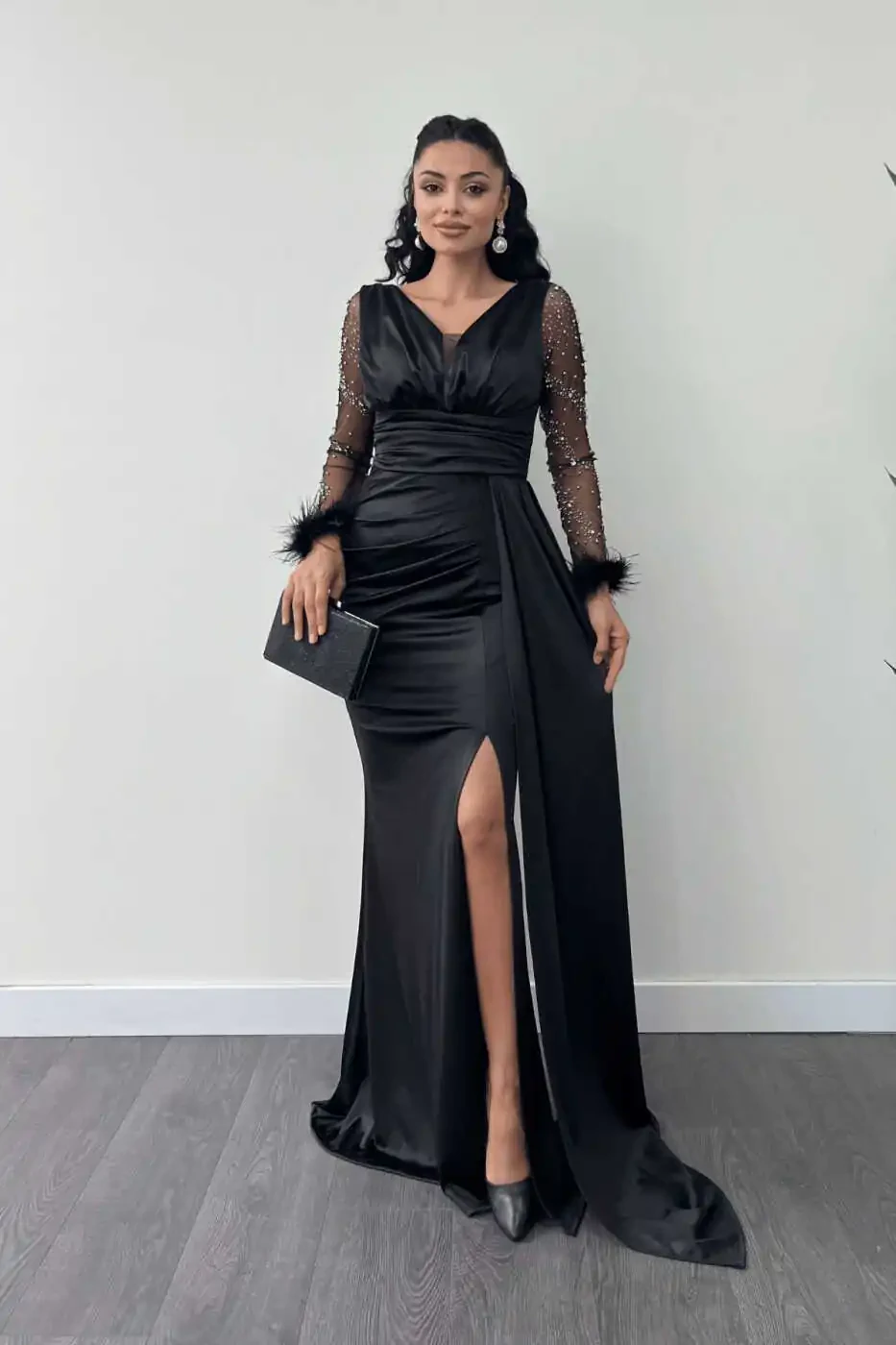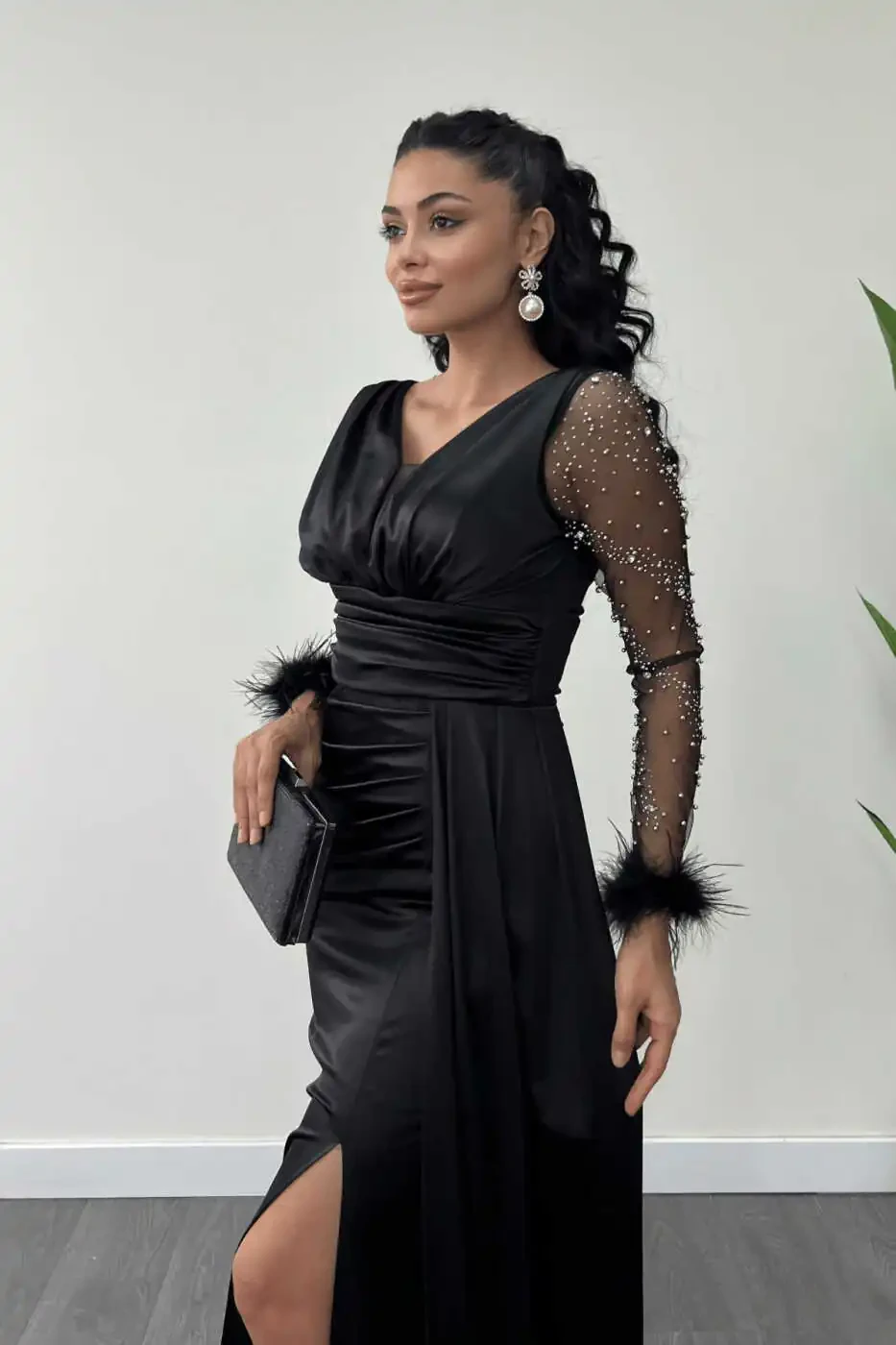 Это платье идеально подходит для самых особых мероприятий, таких как помолвки, свадьбы (в качестве гостя), выпускные балы, специальные гала-ужины, мероприятия на красной дорожке и незабываемые вечеринки. Благодаря полной подкладке внутри оно обеспечивает комфорт и предотвращает прозрачность атласа. Скрытая застежка-молния обеспечивает чистую и эстетичную отделку на спине платья. Струящаяся текстура атласной ткани, сохраняющий форму крой «рыбка» и сочетание деталей из перьев и бисера сделают это платье одним из самых особенных предметов в вашем гардеробе. Это платье-русалка из атласной ткани с оторочкой из перьев на рукавах и деталями из бисера — правильный выбор, когда вы хотите почувствовать себя принцессой, оставить след своим шиком и стать самой заметной персоной вечера. Добавьте блеска своим воспоминаниям с этим уникальным дизайном, сочетающим современные линии с традиционной элегантностью.
