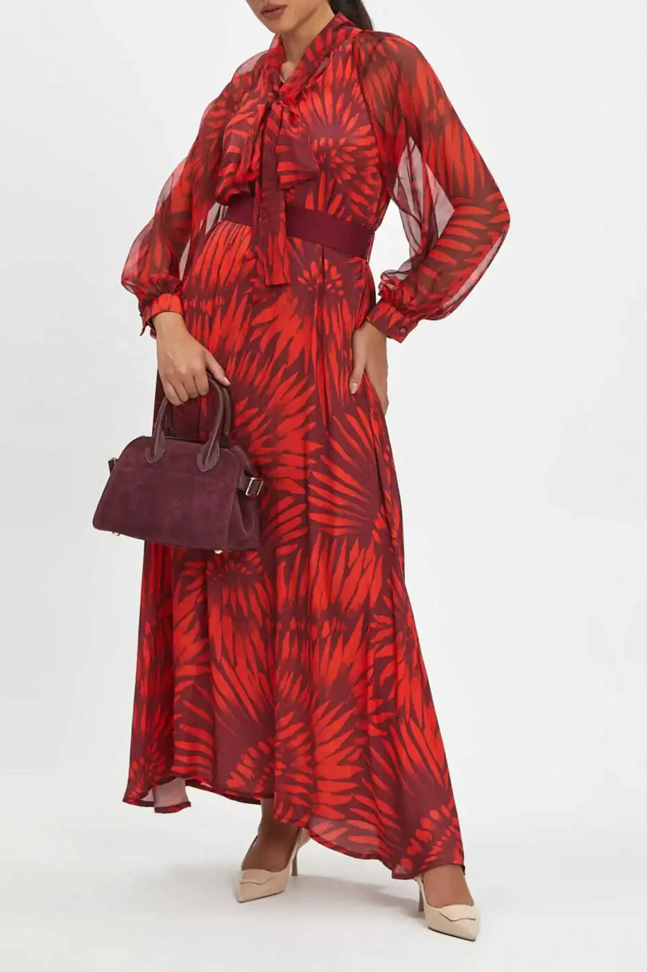 Burgundy Patterned Maxi Dress | Scarf and Belt Detailed