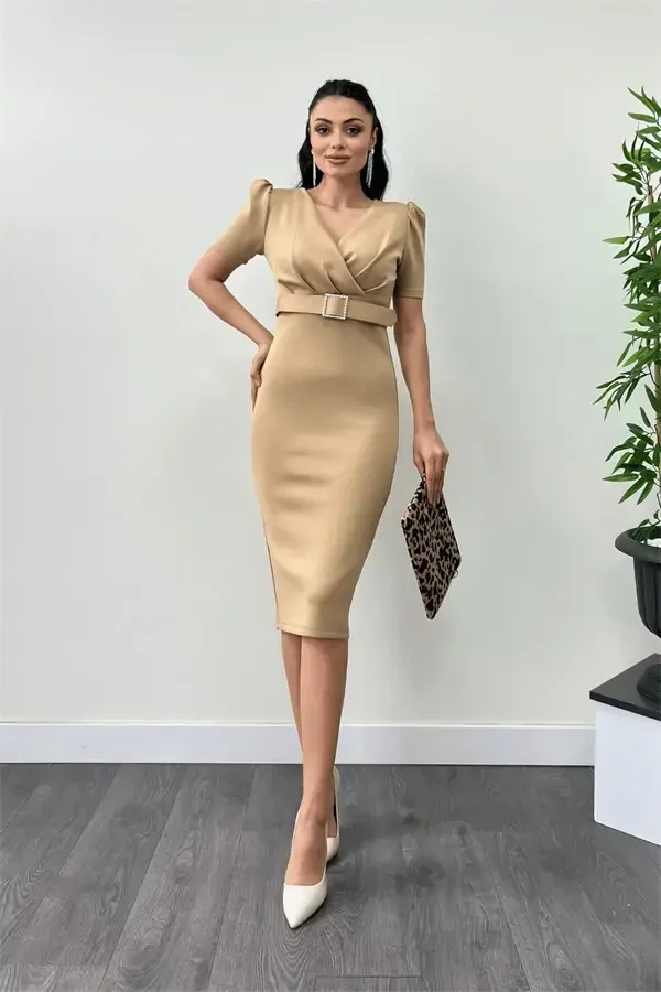 Scuba Fabric Belt Detailed Pencil Dress - BEIGE is a must-have piece in the modern woman's wardrobe. Thanks to its high-quality scuba fabric, it offers comfort all day long, while its body-hugging cut highlights your elegance. The most striking feature of the dress, the belt detail, emphasizes your waist and allows you to achieve a more elegant look. The timeless elegance of the beige color allows you to easily use the dress both at special events and in business environments. Whether you make a stylish combination with high heels or create a more comfortable style with ballet flats, this dress will accompany you in any situation. The flexible structure of the scuba fabric offers all-day comfort without restricting your freedom of movement. The pencil skirt cut emphasizes your femininity, while the knee-length creates both a modern and classic look. The stitching details and quality workmanship of the dress ensure that it will be indispensable in your wardrobe for many years. Scuba Fabric Belt Detailed Pencil Dress - BEIGE is not just a dress, but also an investment that reflects your style and increases your self-confidence. With its wearable structure in every season, you can easily combine it with other pieces in your wardrobe and create different styles. From business meetings to dinners, from special occasions to daily use, this dress, which will make your elegance speak in every environment, is a candidate to be the most loved piece of your wardrobe. Thanks to the durability and easy care of the scuba fabric, it stays as new as the first day for many years. The belt detail adds a different touch to the dress, while also allowing you to reflect your personal style. By changing your belt with different colors and models, you can achieve a different look every time. The warm tone of beige color adapts to every skin tone and can be easily combined with all kinds of accessories. With Scuba Fabric Belt Detailed Pencil Dress - BEIGE, you will always feel stylish, elegant and confident.