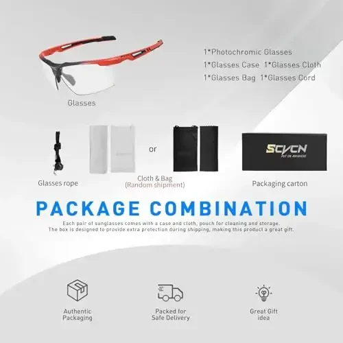 SCVCN Photochromic Sport Sunglasses are designed for outdoor sports such as cycling, running, and fishing. Suitable for both men and women, these sport sunglasses feature UV400 protection, transparent lenses, and color-changing capabilities. They can be safely used in challenging activities like MTB and BMX.