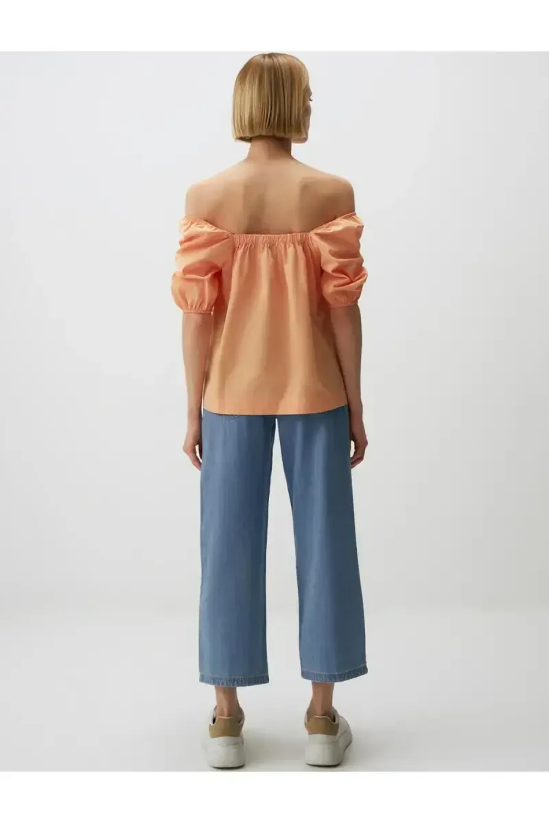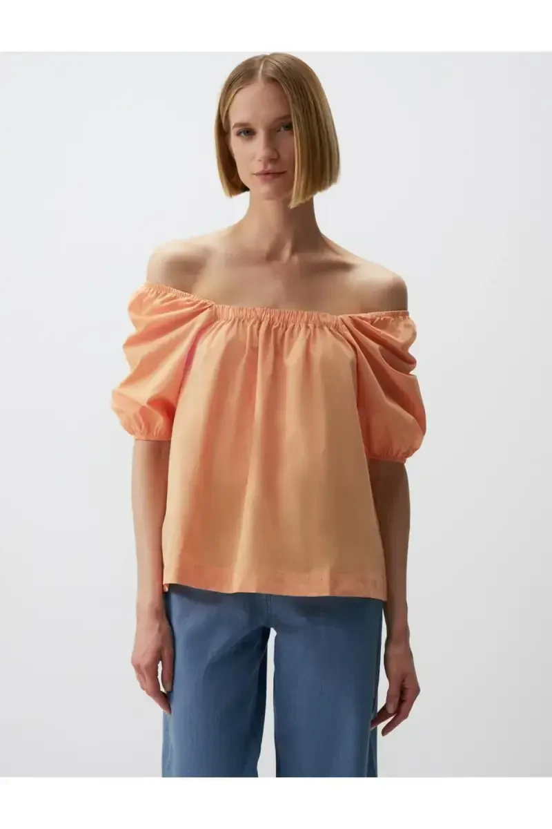 Peach 100% Cotton Square Neck Balloon Sleeve Blouse will be indispensable for hot summer days and spring breezes! This blouse is a candidate to be one of the most favorite pieces of your wardrobe by offering both comfort and elegance together. Thanks to its 100% cotton fabric, you can breathe all day long and have a non-sweating experience. The square neck detail offers a modern and elegant look, while the balloon sleeve design makes the blouse different and remarkable. This blouse, which you can easily use in your daily combinations or special occasions, is a versatile piece that will adapt to any environment. The peach color of the blouse reflects the energy and vibrancy of summer, while adding a pleasant glow to your skin. The square neck design helps you complete your style by providing a perfect harmony with your necklaces and jewelery. Balloon sleeves make the blouse stand out from the ordinary and add a feminine touch. The soft texture of the cotton fabric gently wraps your skin and makes you feel comfortable all day long. This blouse can be easily combined with jeans, skirts, shorts and even tights. You can achieve a comfortable elegance by completing it with sneakers or sandals for daily use, or you can create a dazzling look by combining it with high heels and a stylish bag for a special occasion. Peach 100% Cotton Square Neck Balloon Sleeve Blouse is an excellent choice to help you reflect your style and always feel stylish. It is a timeless piece that will remain in your wardrobe for many years thanks to the quality of its fabric and the care in its workmanship. Don't miss this blouse to feel special and highlight your style!