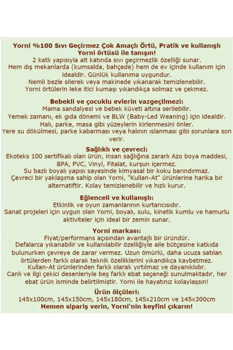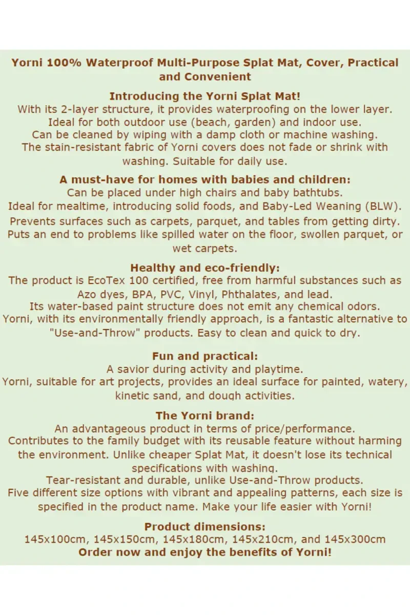 Подложка для детского стульчика для кормления Family 145x100 см от YORNi, разработана для многоцелевого использования как дома, так и на улице. Она делает время приема пищи, игры и творческие занятия ваших детей более приятными и чистыми. Эта прочная и водонепроницаемая подложка защитит ваш ковер, паркет и стол, обеспечивая вам душевное спокойствие. Подложка размером 145x100 см идеально подходит под детский стульчик для кормления, а также может использоваться на пикниках, на пляже, в саду и в других местах вашего дома. Благодаря двухслойной конструкции пролитая на верхний слой жидкость не проникает на нижний слой, поэтому ваши полы остаются сухими и чистыми. Благодаря превосходным грязеотталкивающим свойствам ее можно легко протереть или постирать в машине. Изготовлена из материалов, не содержащих вредных веществ, поэтому ее можно безопасно использовать для вашего ребенка. Яркие и привлекательные рисунки привлекут внимание вашего ребенка, а сама подложка станет практичным и удобным решением. Благодаря возможности стирки и многоразового использования, она прослужит долго, что позволит вам сэкономить деньги и сделать выбор в пользу окружающей среды.