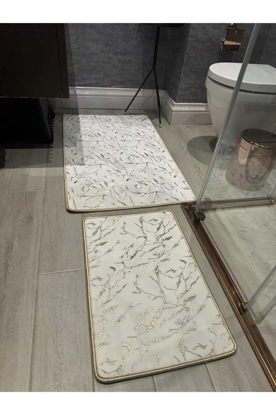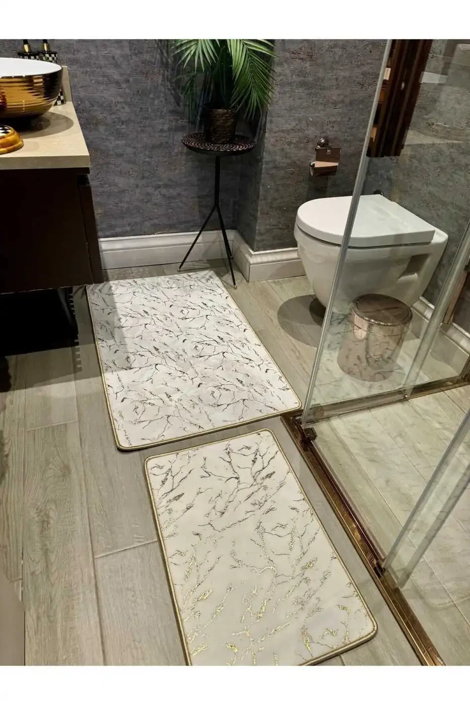 The Glittery Bamboo Non-Slip Leather Base Dust and Stain Resistant 2-Piece Set Toilet Bathroom Rug Set is a product that will add both elegance and practicality to your bathroom. Made from high-quality materials and meticulously designed, this set is a durable product that you can use for many years. Its easy-to-clean structure saves you time. Hand washing is recommended to extend the life of the product and protect the shiny foil. Don't miss the opportunity to benefit from the campaign price with over 100 units in stock! You can buy with peace of mind thanks to the 15-day free return guarantee. Your order will be shipped by YTR HOME. Price differences may be seen as it may be sold by more than one seller. A maximum of 10 items can be ordered. Orders over 10 items may be cancelled by Trendyol. Different limits may apply for corporate orders.