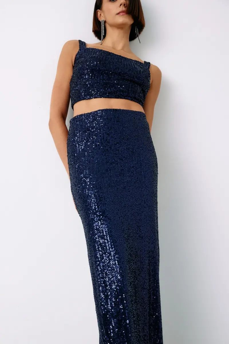 Sequin Crop Blouse - NAVY, combining elegance and grace, has a design that will make you stand out on special occasions or in daily use. This eye-catching blouse allows you to shine like a star with the depth of navy color and the sparkle of sequins. It offers a modern look with its straight neckline and thick straps, while the crop model helps you create a young and dynamic style. Thanks to its inner lining, it offers comfortable use throughout the day. The zipper detail on the side allows you to easily put on and take off the blouse, while adding a stylish touch. This blouse will be a striking piece in any environment, from special invitations to daily combinations. Produced with sateen quality, this blouse is a candidate to be the indispensable of your wardrobe. Whether you combine it with a high-waisted skirt for a stylish invitation look, or create a more casual and comfortable style by combining it with jeans. Let your style speak for itself anytime and anywhere with the Sequin Crop Blouse - NAVY.