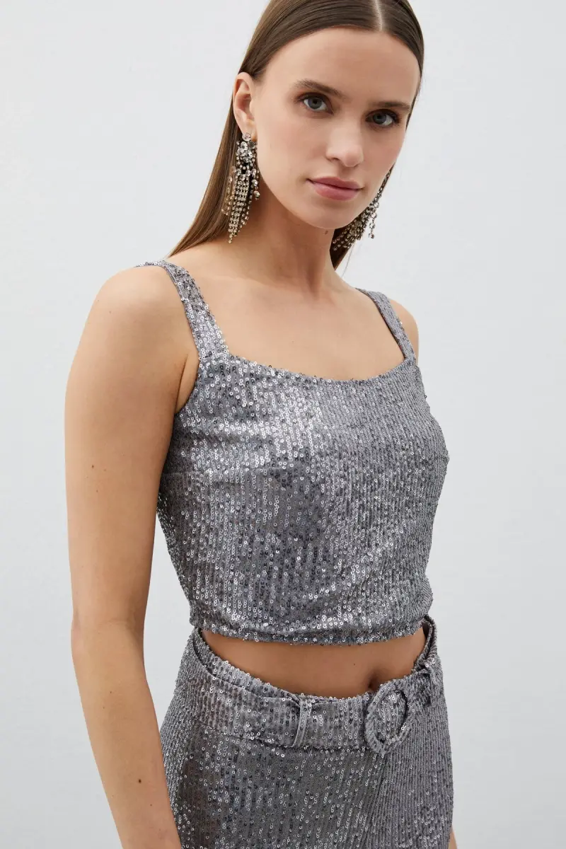Meet the Sequin Crop Top - SILVER-SILVER, the perfect combination of dazzling elegance and unique style! This top will be indispensable for your special occasions, parties, or just when you want to add sparkle to your daily style. This crop top, which attracts attention with its modern and bold design, offers both stylish and comfortable use thanks to its high-quality material and flawless workmanship. The enchanting sparkle of silver color combines with the dynamic texture of sequins to create a work of art. With this top that shines in every light, all eyes will be on you in any environment you enter. The crop cut is in perfect harmony with high-waisted pants, skirts or shorts, so you can create different combinations and reflect your own style. Thanks to its flexible fabric, it fits your body perfectly and does not restrict your freedom of movement. This top is not just an outfit, but also a form of expression. Take your style to the next level with the Sequin Crop Top - SILVER-SILVER, the choice of confident, stylish and free-spirited women!