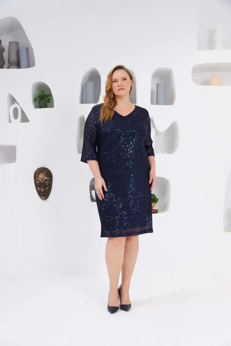 Plus Size Sequin Evening Dress Navy Blue is an elegant and assertive option designed for plus size women who want to dazzle at special events and stylish occasions. This evening dress, with its perfectly fitting cut, sparkling sequin details and noble navy blue color, ensures you will attract attention in any environment.Product DescriptionPlus Size Sequin Evening Dress Navy Blue has a special design that combines elegance and comfort. The nobility of the navy blue color combines with the sparkle of the sequins to create a fascinating look. The dress is designed to best emphasize the body lines of plus size women. The slight drapes at the waist and the slightly flared cut towards the hem help to create an hourglass silhouette. In this way, it both makes you look slimmer and does not restrict your freedom of movement. The fabric of the dress has a high-quality and flexible structure. In this way, it can be worn comfortably all day long and offers a perfect look by taking the shape of your body. Thanks to its inner lining, it prevents direct contact with your skin and provides comfortable use throughout the day. Sequins are applied to the fabric with a special technique and do not fall off. Thus, it preserves its sparkle for many years. This evening dress is an ideal choice for many different events such as weddings, engagement ceremonies, graduation balls, special invitations and stylish cocktails. You can create an unforgettable combination by completing your dress with high heels, a stylish bag and elegant jewelry. You can achieve a perfect look by leaving your hair up or down and doing your make-up in tones suitable for the color of the dress. Plus Size Sequin Evening Dress Navy Blue not only offers a stylish look, but also makes you feel special and confident. Thanks to this dress, which best emphasizes your body lines, you can confidently show yourself in any environment. This evening dress, which will be one of the indispensable pieces of your wardrobe, will always add elegance and grace to you. This special design, which will help you create unforgettable memories, will always make you feel special. Get ready to attract all the attention with this dress that will fascinate you with its sparkle and elegance.Product FeaturesSpecially designed for plus size women.It is navy blue and sequined.It has a cut that perfectly hugs the body.It is made of high quality and flexible fabric.It offers comfortable use thanks to its inner lining.It has sequins that do not fall off.Ideal for weddings, engagements, graduations and special occasions.Additional InformationIt is recommended to dry clean the dress. It is important to pay attention to the usage instructions to ensure the product lasts a long time. Different size options are available. Please review the size chart and choose the size that suits you. Make sure that the jewelry and bags you will use as accessories are compatible with the color and style of the dress.