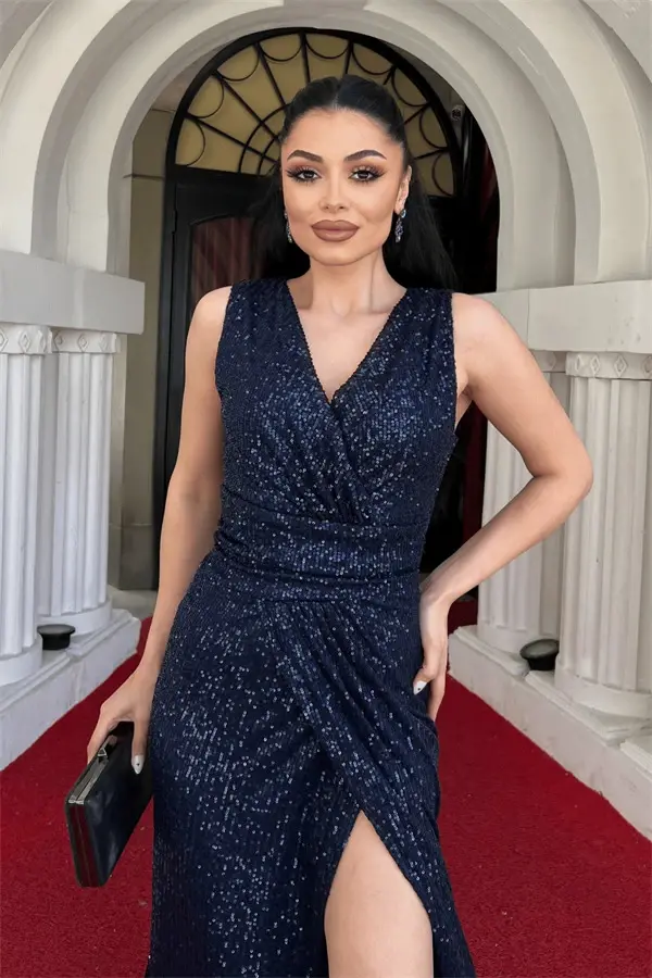 Our product is made of sequin fabric. It is a mermaid style. It is lined. There are drapes on the chest and shoulders. There is a ruffle detail at the hem. Here is the product description in the format you requested:Product DescriptionGet ready to add sparkle to the night with the Sequin Fabric Mermaid Evening Dress - NAVY BLUE! This magnificent evening dress will make you dazzle with your elegance at special occasions, weddings and all your special moments. The nobility of the navy blue color and the sparkle of sequins come together to offer a mesmerizing look. The mermaid cut perfectly reveals your body lines, while the ruffle detail at the hem adds movement and gives the dress a dynamic feel. An ideal choice for those who want to be the star of the night. The inside of the dress is lined, so you can move comfortably and freely all day long. The lining increases your comfort by preventing the sequins from touching your skin. The drapes on the chest and shoulder area add a sophisticated touch to the dress, while also making your body lines even more beautiful. The drapes emphasize your feminine silhouette and make you look more elegant. This evening dress is not just a dress, but also a work of art. Every detail has been carefully designed and crafted. The sequins perfectly reflect the light, allowing you to shine with every movement. The mermaid cut helps you achieve a long and elegant look, while the ruffle detail adds a fun and romantic touch to the dress. Make it a night to remember with the Sequin Fabric Mermaid Evening Dress - NAVY BLUE. Make this magnificent dress an indispensable part of your wardrobe to feel special and beautiful. It will inspire you every time you look at it and will always represent you at your best. This evening dress is not just a dress, but also a style statement. It is a perfect choice to reflect your own style and emphasize your uniqueness. What are you waiting for to be the most stylish and eye-catching woman of the night? Create unforgettable memories with this evening dress that will accompany you in every special moment and highlight your elegance and style. Attract all the attention at parties, cocktails, graduation ceremonies and many other special events. The Sequin Fabric Mermaid Evening Dress - NAVY BLUE is not just a dress, but also a source of self-confidence. Get this magnificent dress now to feel good and shine!Product Features* Made of sequin fabric.* Mermaid style.* Lined.* Drape details on the chest and shoulders.* Ruffle detail at the hem.* Navy blue.* Ideal for special occasions.* Offers a stylish and elegant look.* Perfectly reveals body lines.* Provides comfortable and convenient use.Additional InformationThe size on the model is 36. Dry cleaning is recommended. The product is available in different sizes. There may be differences in color tone depending on the screen features.