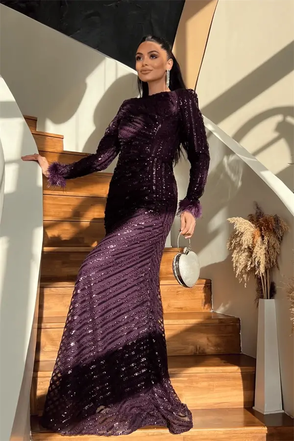Dazzle on your special occasions with the Sequin Fabric Hijab Evening Dress - EGGPLANT PURPLE, which combines a stylish and elegant look! This magnificent evening dress reflects the elegance of hijab clothing and draws attention with its modern details. The noble tone of eggplant purple combines with the sparkling sequins to offer a fascinating look. The design of the evening dress is carefully prepared to fit every body type. This dress, which you can easily choose for special events such as engagements and weddings, as well as a stylish dinner, will be an indispensable part of your wardrobe.Product DescriptionSequin Fabric Hijab Evening Dress - EGGPLANT PURPLE is the perfect choice to highlight your elegance and grace on your special occasions. This evening dress is qualified to win the appreciation of every woman with its modern design and cut suitable for hijab clothing. The deep and impressive tone of eggplant purple combines with the sparkling sequins to offer a dazzling look. The sparkling sequins in every move add a different atmosphere to the evening dress and support your noble stance. The fabric of the dress has a high quality and comfortable texture. In this way, you can maintain your elegance without sacrificing your comfort even at long-lasting events. The cut of the evening dress gently emphasizes your body lines while fulfilling the requirements of hijab clothing. The wide skirt provides freedom of movement and creates a stylish look. Sleeve details and collar design add a different dimension to the evening dress. You can choose this evening dress especially for special events such as engagements, weddings, graduation ceremonies, and it is also ideal for a stylish dinner or celebration. All eyes will be on you with the Sequin Fabric Hijab Evening Dress - EGGPLANT PURPLE! This evening dress is not just a piece of clothing, but also a form of expression. This evening dress, which will make you feel special and beautiful, is a candidate to be one of the most valuable pieces of your wardrobe. Make a difference in every environment with this evening dress that offers elegance and grace together. Get ready to be talked about with your style while collecting unforgettable moments. Sequin Fabric Hijab Evening Dress - EGGPLANT PURPLE has come to be the evening dress of your dreams.Product Features* High quality sequin fabric* Design suitable for hijab clothing* Stylish and elegant eggplant purple color* Wide cut skirt* Comfortable and convenient use* Ideal for special events* Modern and eye-catching detailsAdditional InformationDry cleaning is recommended to use your product for a long time. Different size options are available. There may be slight differences in color tone depending on screen properties.