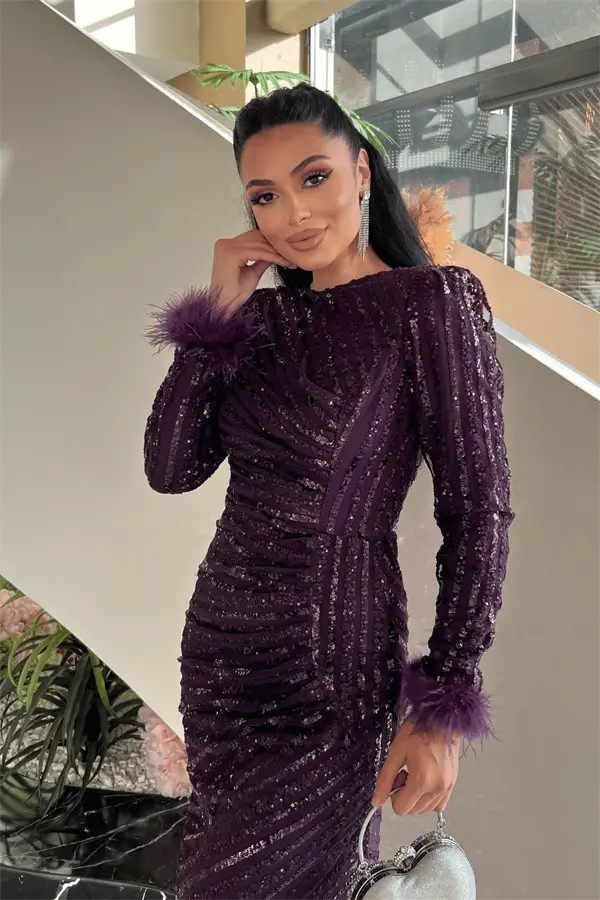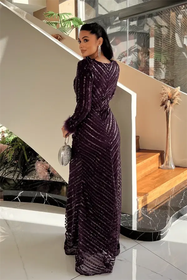 Sequin Embellished Evening Dress - Eggplant Purple Modest Evening Dress | Stylish and Elegant Party Dress
