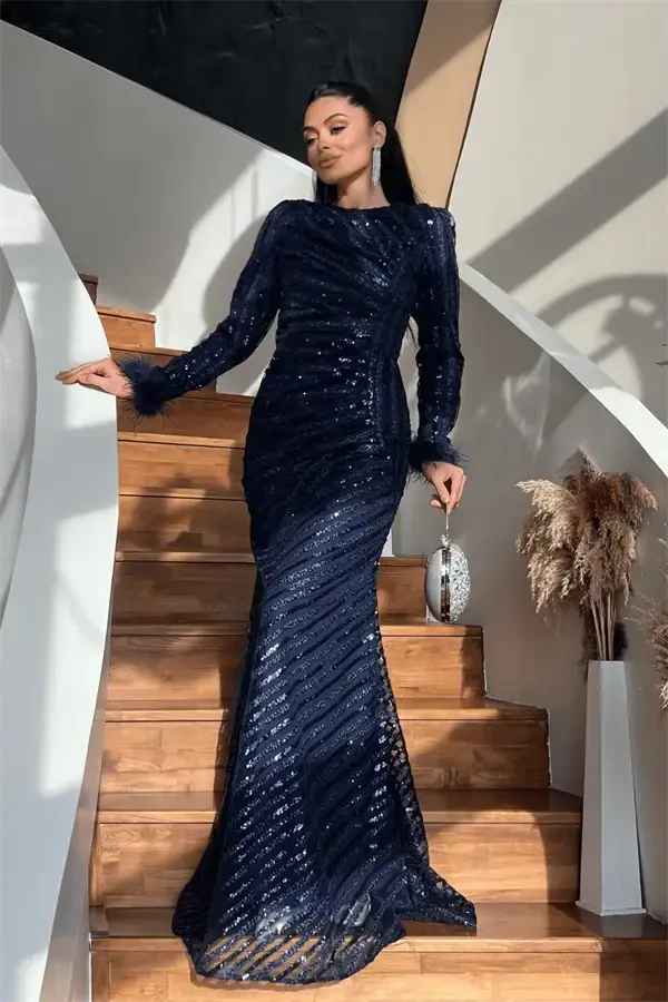 Sequin Fabric Hijab Evening Dress - NAVY BLUE is a stunning option that will highlight your elegance at your special occasions and events. The nobility of navy blue combines with the sparkle of sequins to offer a dazzling look. This evening dress is a stylish and conservative alternative for women who embrace the hijab fashion style. Its design blends modern details and traditional lines, reflecting an aesthetic understanding that appeals to all tastes. The length of the dress is 155 cm from the shoulder, which is an ideal length that women of different heights can easily prefer. (Please note that there may be variations between 1-3 cm in the stated measurement.) The sequin fabric used adds movement and vitality to the dress, while the quality of the fabric offers a long-lasting usage experience. The evening dress has a zippered design at the back, making it easy to put on and take off and ensuring it fits perfectly on you. The lining on the inside both increases comfort and helps the dress to stand more smoothly. Thanks to its lined structure, there is no see-through problem and it offers a comfortable use all day long. There is no bustier in the product. It is designed as a full mold and does not stretch, so it is important to choose your own size. It creates a stylish silhouette with its cut that gently wraps your body lines. Sequin Fabric Hijab Evening Dress - NAVY BLUE is a versatile piece that can be worn in many different events such as weddings, engagements, graduation ceremonies and special invitations. It can be adapted to different styles with accessory selection; You can achieve an unforgettable look by combining it with a stylish scarf, an elegant necklace and high heels. This evening dress will be an indispensable part of your wardrobe and will make you feel special every time you wear it. The texture and workmanship of the fabric help you reflect your elegance and style in the best way. The model's measurements (Height: 1.68 cm, Weight: 52, Bust: 85, Hips: 90) can give you an idea of how the dress might look on you. But remember, every body type is different and you can get the most accurate result by considering your own measurements. Get ready to be the star of the night with Sequin Fabric Hijab Evening Dress - NAVY BLUE!