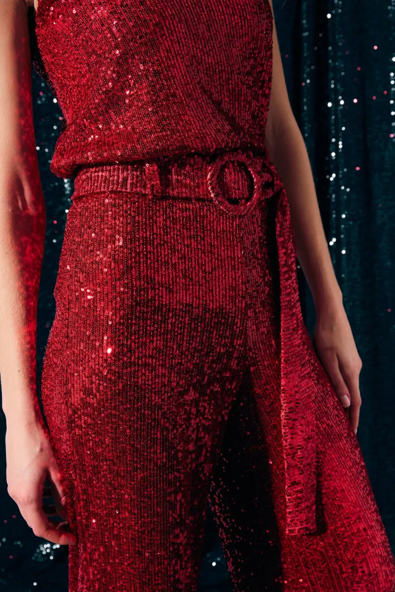 Sequin Pants with Belt - Red, features a special design that combines elegance and comfort. Made of 100% polyester material, the trousers are long-lasting and durable. Its lined structure provides comfortable use throughout the day, while providing freedom of movement. Sequin details add a dazzling shine to the trousers, allowing you to attract attention in any environment. The straight cut adapts to different body types, creating a classic and timeless style. The normal waist design gently hugs your figure while providing all-day comfort. The plain pattern will be an indispensable part of your wardrobe thanks to its easy combination with different tops. Thanks to the easy-care feature of polyester fabric, it offers practical use, while the woven type ensures that the trousers' shape is preserved and provides flexibility. These trousers appeal to a wide range of users with their stylish and modern design that appeals to all age groups. The red color provides an energetic and vibrant look, while combined with sequin details, it allows you to make a difference in any environment, from special invitations to daily use. Cleaning according to Type1 washing instructions prolongs the life of the trousers and ensures that they always look like new. Sequin weave type adds sparkling details, offering an eye-catching look in any environment. The belt detail adds a special elegance to the trousers, while making your waist more defined and beautifying your silhouette. These trousers are not only stylish, but also a comfortable and useful option. It is a piece that should definitely be in your wardrobe, will easily adapt to any combination and will always make you feel special.