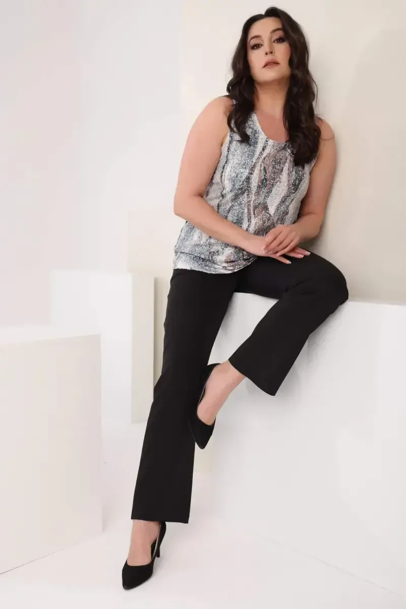 Be the star of the night with the Sequin Wide Strap Evening Black Blouse! This modern and impressive blouse will make you the center of attention in any setting with its shiny fabric and stylish design. Especially the dazzling sequins on the front elevate the elegance and chicness of the blouse. The wide straps provide both comfortable use and gracefully emphasize your shoulders, adding a modern touch to your outfit. This evening blouse, which fits your body perfectly thanks to its flexible fabric, allows you to look stylish without restricting your freedom of movement. The comfortable fit offers comfortable use throughout the day, while the hip-length allows it to be easily combined with your skirts and trousers. Whether you use it for a special invitation, a stylish dinner or to liven up your daily style, this blouse will always be the right choice. This special design, which combines the nobility of black and the sparkle of sequins, is a candidate to be one of the indispensable pieces of your wardrobe. Produced with Modazone quality, this blouse offers long-lasting use and ensures that you always look your best without sacrificing your elegance. Thanks to its fine workmanship and quality material, this blouse, which appeals to both your eyes and your skin, is the perfect choice to complete your style. This blouse is not just a garment, but also a form of expression. Discover this unique piece now to feel special, reflect your sparkle and reveal your style! With the magic of black and the charm of sequins, you will feel confident and stylish in any environment. Remember, being stylish is hidden in the details and this blouse offers those details in the best way.