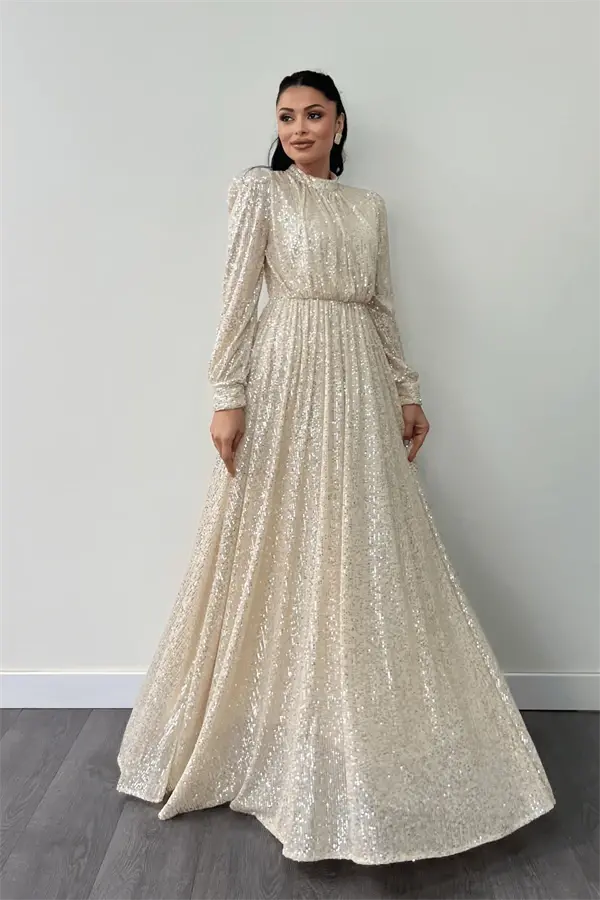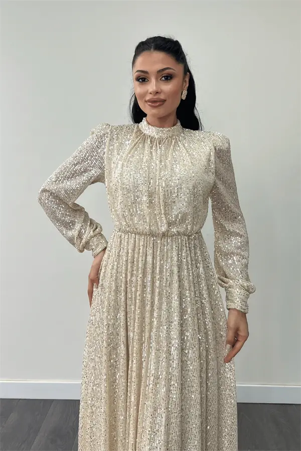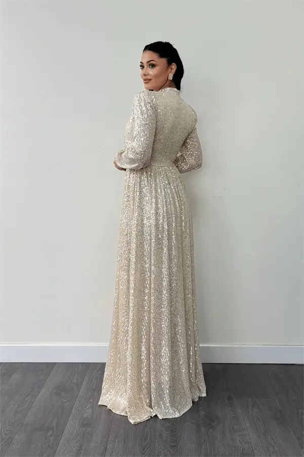 Designed for those seeking dazzling elegance and sophistication, the Sequin Tulle Payette Fabric Ruched Detail Flared Dress - GOLD will ensure you attract all the attention at your special occasions and events. The enchanting shimmer of gold, combined with the lightness of tulle and the eye-catching sparkle of sequins, makes this dress look like a work of art, and will be one of the most valuable pieces in your wardrobe. The flared skirt of the dress creates an elegant silhouette without restricting your freedom of movement, while the ruched details add a modern and dynamic touch to the design. With details that give a custom-made feel and flawless workmanship, this dress will make you feel special at all times.The unique texture of the sequin tulle payette fabric perfectly reflects light, offering a mesmerizing look from every angle. The length of the dress is 155 cm from the shoulder (may vary between 1-3 cm), allowing you to display both an elegant and modern stance. The zipper detail on the back allows the dress to be easily put on and taken off, while also complementing its stylish design. This dress, which offers comfortable use throughout the day thanks to its inner lining, is also suitable for those who prefer modest wear. The absence of bust cups offers the freedom to combine with different underwear options.This magnificent dress is not just a piece of clothing, but also a form of expression. This special design, which reflects your stance, style and taste, will make you stand out in any environment. Whether you wear it to a wedding, a cocktail party or a special invitation, you will create unforgettable memories with the Sequin Tulle Payette Fabric Ruched Detail Flared Dress - GOLD. While dazzling with your elegance, you will also enchant with your grace. When you wear this dress, you will feel like a star. Every detail of this dress, carefully thought out, will make you feel that it was designed specifically for you. This piece, which should definitely be in your wardrobe, will always give you a stylish and confident look. Don't miss this dress to feel special and create unforgettable memories.