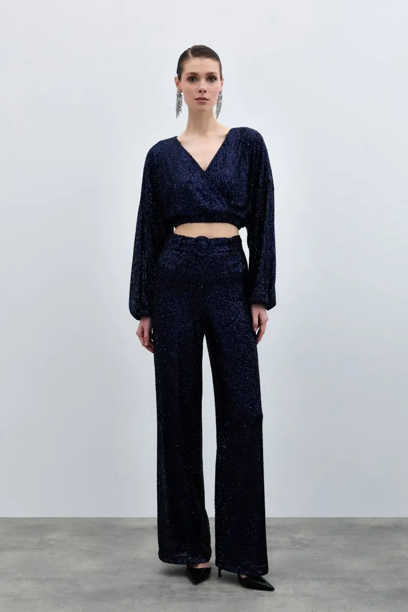 Sequin Pants with Belt - Navy Blue, is a candidate to be the star piece of your wardrobe with Sateen's assurance! Combining elegance and comfort, these pants will allow you to make a difference in any environment, from special occasions to daily use. This design, which combines the nobility of navy blue with the sparkle of sequins, offers a modern and sophisticated look. The high-waisted cut perfectly reveals your body lines, while the wide-leg model does not restrict your freedom of movement. Thanks to its inner lining, you will have a comfortable wearing experience throughout the day. The side zipper detail allows the pants to be easily put on and taken off, while the belt accessory adds a stylish touch to your combination. Whether you create a stylish evening combination with heels, or add sparkle to your daily style with sneakers, these pants will always be the star of your style. Produced with Sateen quality, these pants will maintain their place in your wardrobe for many years with their long-lasting and durable structure. Reflect your style with Sequin Pants with Belt - Navy Blue, dazzle in every environment! The product on the model is size 36/S, and the model's measurements are height: 1.76, bust: 83, waist: 60, hips: 90. These measurements will give you an idea of how the pants will look on you. These pants, which are an ideal choice for women looking for elegance and comfort together, are candidates to be indispensable for your wardrobe. Remember, this special design is limited in stock. Hurry to take advantage of the campaign price and own this unique piece!