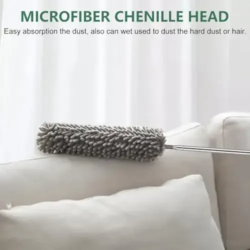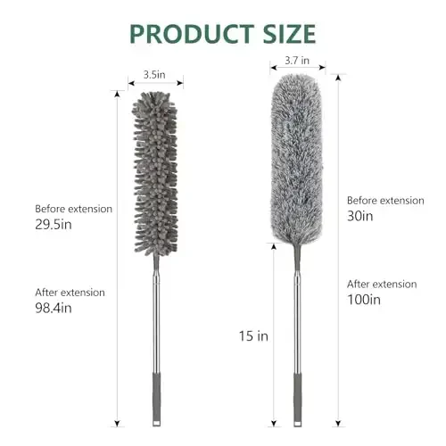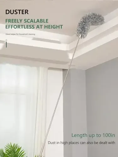 EXTENDABLE DUSTER - This telescoping duster can be extended to 100". Extend the high duster to the length you need. For cleaning jobs of different heights, just this household cleaning tool is enough. COMFORTABLE TO GRIP - Ergonomic design, plastic material at the end of the handle, durable and non-slip, more comfortable to grip. A good fan duster, also an excellent wall duster. Make you fall in love with cleaning. BENDABLE MICROFIBER DUSTER - Includes stainless steel extension pole*1, microfiber duster head*1, chenille duster head*1. Bendable duster head can quickly capture and absorb fine dust and hair on the ceiling fan. WASHABLE DUSTER - Our duster is easy to disassemble, replace and wash. Just remove the duster head from the pole, wash it with warm water, then hang it in a ventilated place to make it fluffy for next use. BETTER GUARANTEE - If you experience an issue with our microfiber duster, please get in touch with us to repair or replace it. And if you have any questions during use, contact us at any time, we will solve them for you.